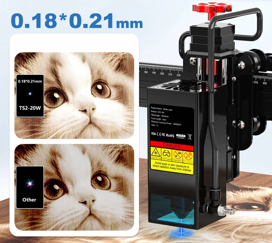 Model TS2-20W wykorzystuje zaawansowany moduł lasera diodowego o mocy 20 W (4 x 5 W), który zapewnia wysoką wydajność w grawerowaniu i cięciu różnych materiałów. Dzięki niezwykle małemu punktowi lasera o wymiarach 0,18 x 0,21 mm, ploter oferuje wyjątkową precyzję pracy, umożliwiając uzyskanie bardzo szczegółowych i realistycznych grawerów. Mocny strumień skupionej energii pozwala ciąć drewno do 20 mm, czarny akryl do 12 mm płyty MDF do 10 mm oraz plastik do 6mm grubości, nawet w jednym przebiegu. Automatyczne ustawianie ostrości eliminuje potrzebę ręcznej kalibracji, co znacząco zwiększa wygodę użytkowania i skraca czas przygotowania projektu.