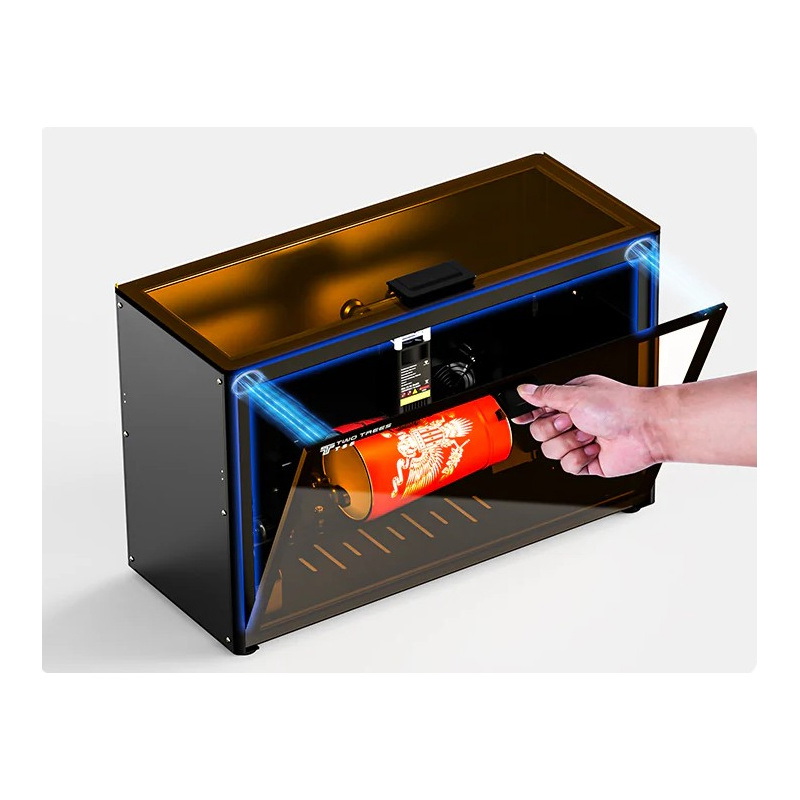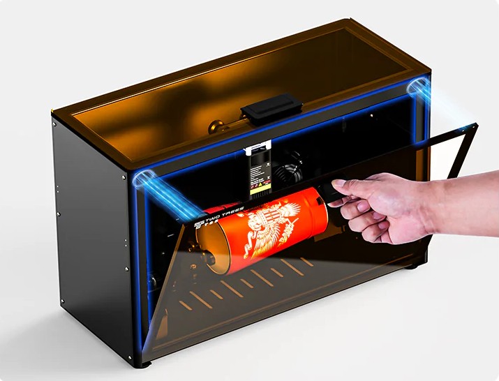 W tym modelu zadbano o bezpieczeństwo użytkownika oraz komfort pracy, dzięki zastosowaniu obudowy chroniącej przed promieniowaniem i pyłem. Obudowa jest wyposażona w system odciągu dymu i kurzu, co pozwala na grawerowanie w czystym środowisku. Zastosowanie specjalnego filtra powietrza skutecznie blokuje szkodliwe niebieskie światło oraz dym powstający w trakcie obróbki materiałów, zapewniając bezpieczeństwo i lepszą widoczność. Dzięki temu grawerowanie w zamkniętym środowisku jest możliwe bez konieczności martwienia się o zanieczyszczenie powietrza.