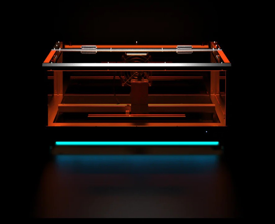 Maszyna wyposażona jest w wbudowany pasek LED, który sygnalizuje różne stany pracy oraz pozwala kontrolować proces grawerowania. Dodatkowo oświetlenie otoczenia roboczego ułatwia obserwację postępu projektów, co zwiększa komfort i precyzję pracy.