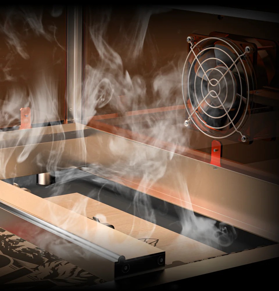 System odprowadzania dymu z wentylatorem i rurą wyciągową usuwa szkodliwe opary powstające podczas grawerowania i cięcia. Dzięki temu masz zapewnione bezpieczne, czyste i komfortowe środowisko pracy. Poprawiona filtracja minimalizuje ryzyko osadzania się zanieczyszczeń na soczewkach oraz elementach mechanicznych.
