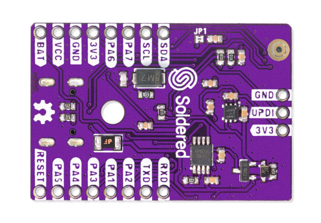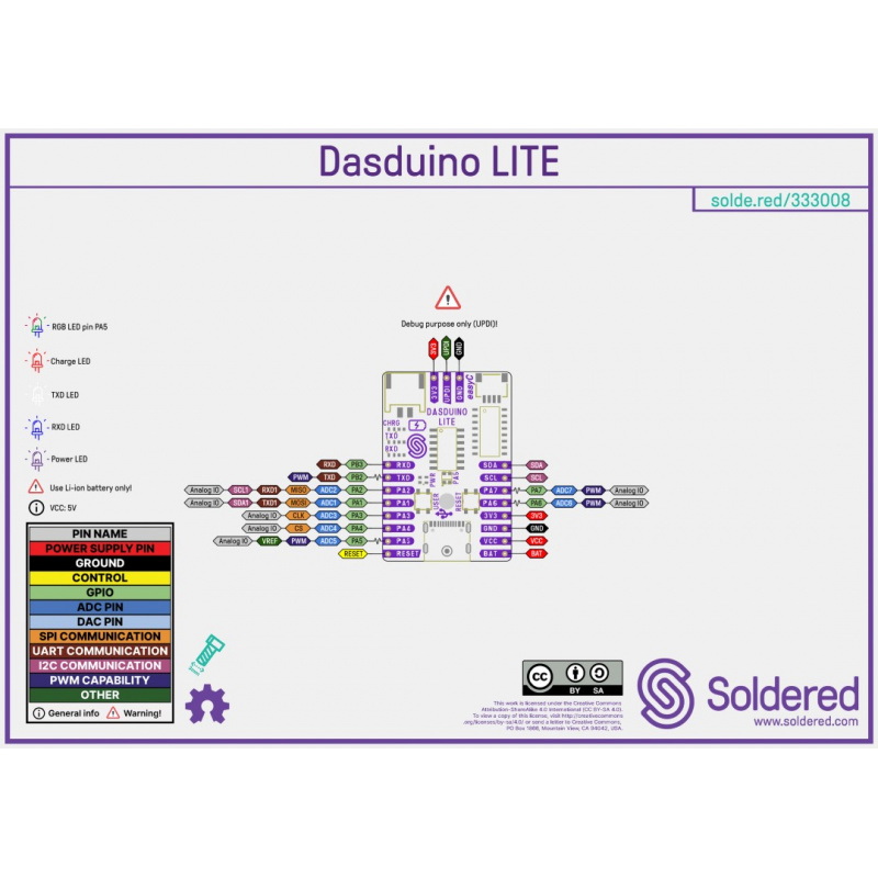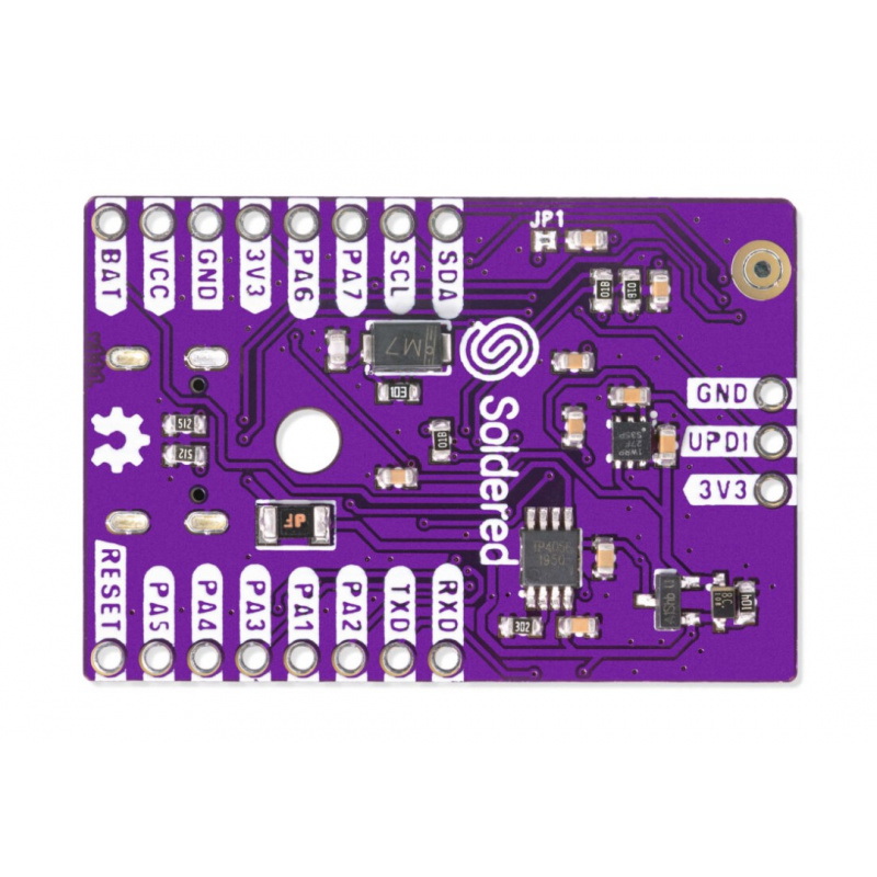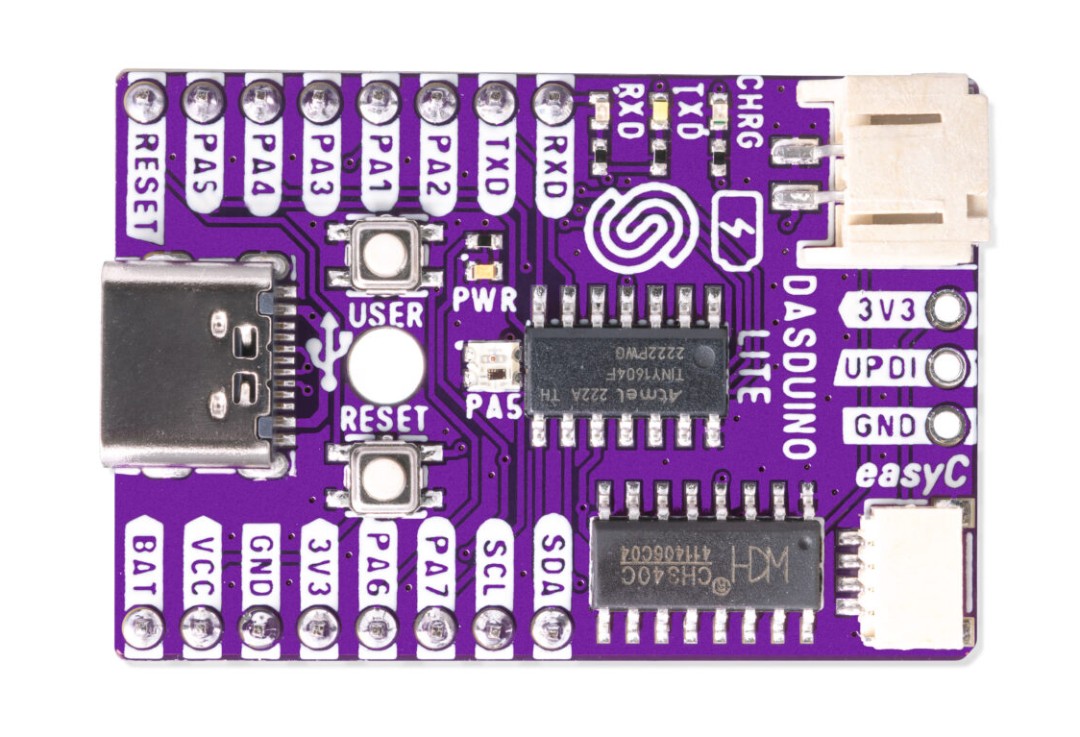 Dasduino LITE marki Soldered to niezwykle poręczna płytka rozwojowa oparta na mikrokontrolerze ATtiny1604, która łączy niewielkie wymiary z kluczowymi funkcjami. Zaledwie 38 x 26 mm rozmiaru czyni ją idealną do zastosowań, gdzie liczy się każdy milimetr przestrzeni. Pomimo małych rozmiarów, płytka oferuje 12 wyprowadzeń GPIO, z czego 9 można używać jako wejścia analogowe. Wbudowana ładowarka akumulatorów Li-Ion, pełna dioda RGB WS2812B, port USB typu C oraz złącze easyC sprawiają, że Dasduino LITE jest w pełni funkcjonalnym narzędziem gotowym do integracji w różnych projektach.
