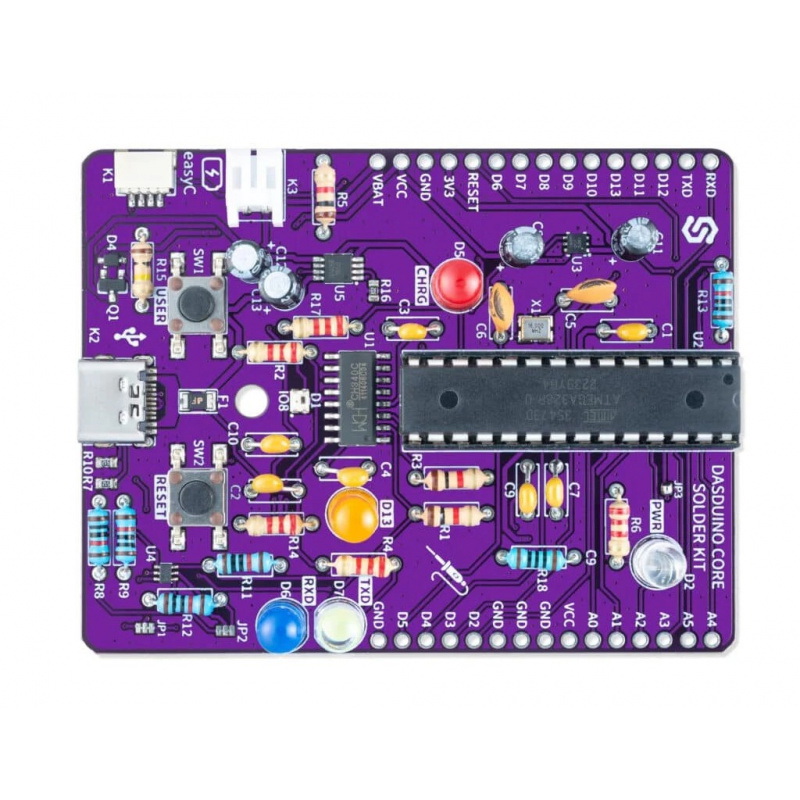 Make your own Dasduino Solder Kit od Soldered to kompletny zestaw edukacyjny, który pozwala na praktyczną naukę lutowania poprzez samodzielne złożenie funkcjonalnej płytki mikroprocesorowej. Zestaw oparty jest na popularnym mikrokontrolerze ATmega328P, znanym m.in. z płytek Arduino. Komponenty SMD są fabrycznie przylutowane, dzięki czemu lutujesz jedynie elementy THT, co czyni zestaw idealnym dla początkujących. Moduł jest w pełni zgodny z otwartym standardem easyC, a projekt dostępny jest jako open-source, wraz z dokumentacją na GitHub.