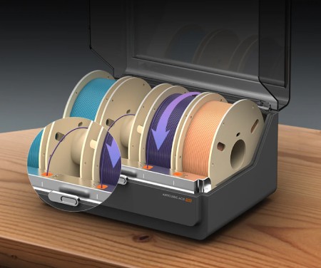 Moduł posiada podwójny system grzewczy PTC o łącznej mocy do 200 W, który utrzymuje suche warunki wewnątrz, podgrzewając filamenty nawet do 55 °C przez całą dobę. Dzięki temu eliminowane jest ryzyko nasiąkania wilgocią i związanych z tym defektów drukowanych modeli. Zamknięta konstrukcja materiału chroni przed zakłóceniami środowiska zewnętrznego.