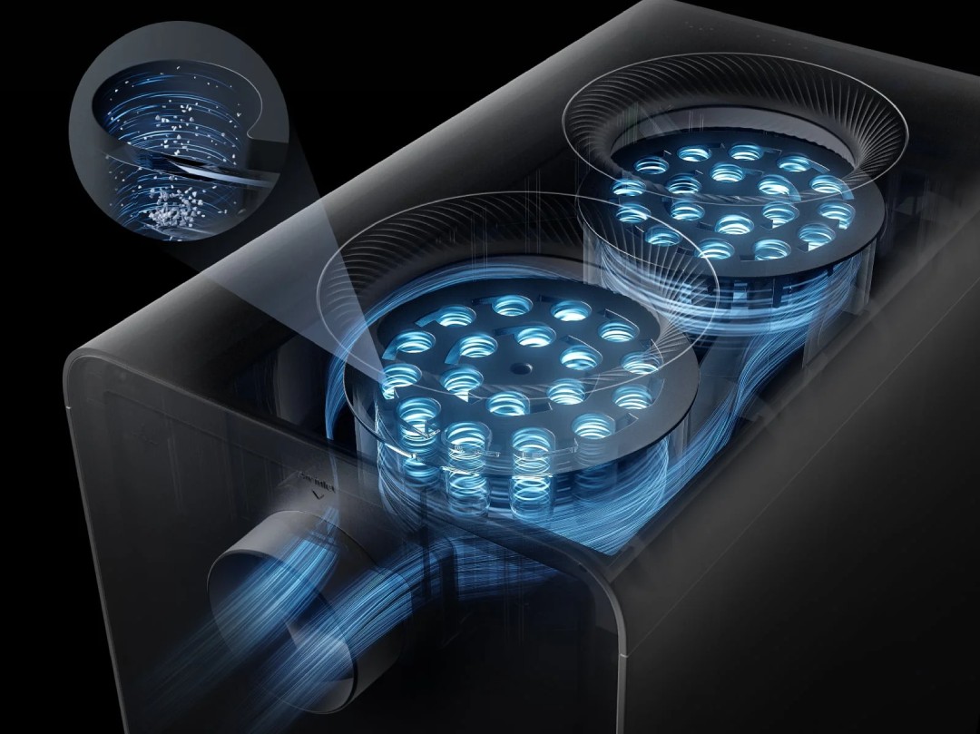 36 małych grup cyklonowych działa równolegle, generując ogromną siłę odśrodkową, skutecznie oddzielając kurz i brud oraz zapobiegając zatykaniu się filtrów.