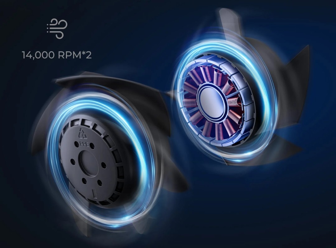 - Podwójny wentylator TurboBoost: dwa wirniki 14 000 obr./min generują mocny przepływ powietrza do 152 CFM