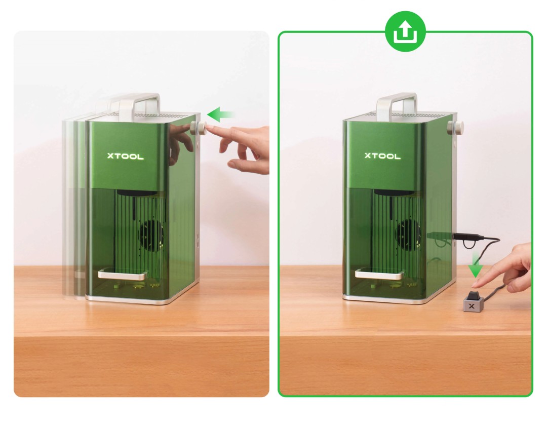 Przycisk sterujący xTool F1 pozwala na pełną kontrolę procesu grawerowania z poziomu wygodnego panelu fizycznego. Jego działanie jest intuicyjne i dostosowane do różnych etapów pracy urządzenia: