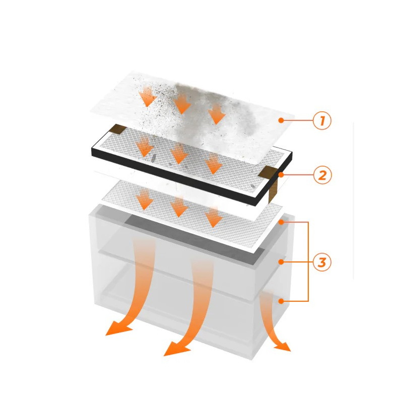 Oczyszczacz dymu wykorzystuje zaawansowany system trzech filtrów, który usuwa pyły, dym i szkodliwe gazy. Pierwszą warstwę stanowi filtr wstępny (bawełna filtracyjna niskiej skuteczności), zatrzymujący większe cząstki stałe i chroniący kolejne stopnie. Następnie powietrze trafia na filtr średniej skuteczności (bawełna filtracyjna o strukturze plastra miodu), który wychwytuje do 99,97% cząstek o wielkości 0,3 μm. Ostatni etap to filtr wysokiej skuteczności (bawełna filtracyjna z węglem aktywnym), neutralizujący lotne związki organiczne i nieprzyjemne zapachy.