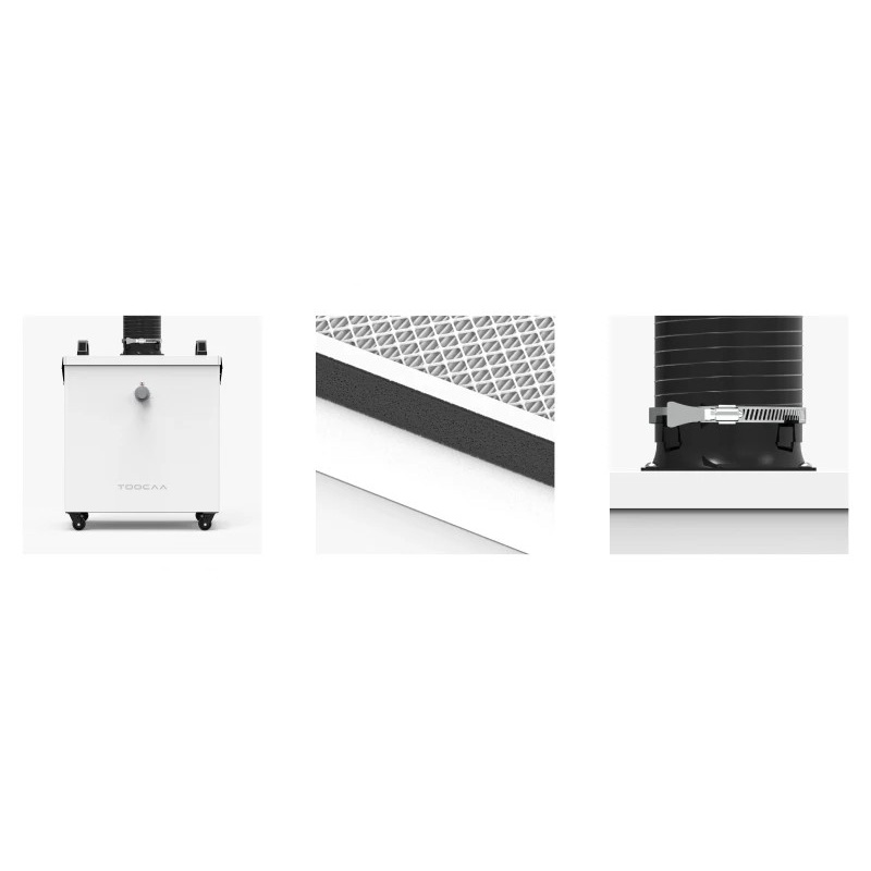 Oczyszczacz dymu TOOCAA Smoke Purifier skutecznie eliminuje dym, pyły i opary powstające podczas cięcia oraz grawerowania laserowego. Zastosowany system trzystopniowej filtracji (filtr wstępny, filtr średniej skuteczności, filtr wysokiej skuteczności z węglem aktywnym) zapewnia świeże i bezpieczne powietrze w pracowni. Kompaktowa obudowa z uchwytami i kółkami ułatwia transport, a uszczelniona konstrukcja zapobiega wyciekom dymu, gwarantując wysoką skuteczność działania.