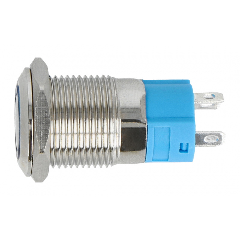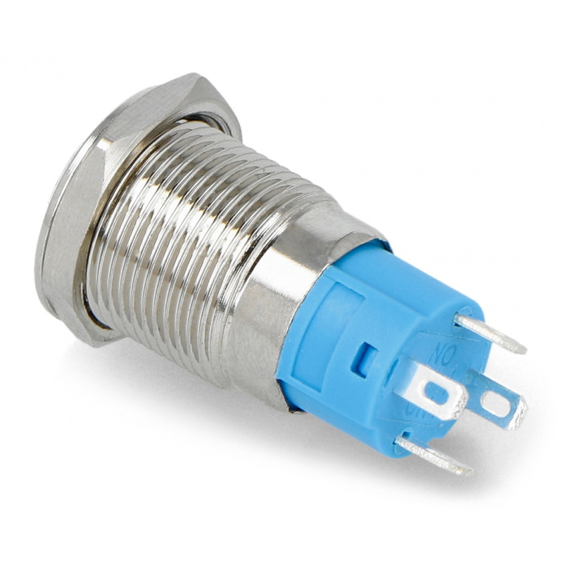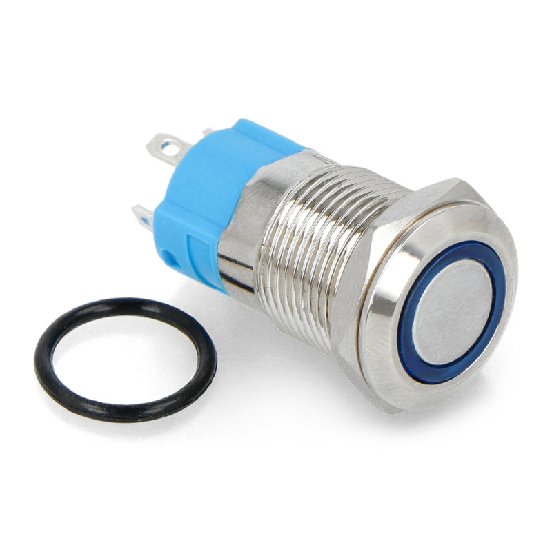 Przełącznik płaski, bistabilny o niebieskim podświetleniu. Obciążalność styków 2 A dla 250 V.