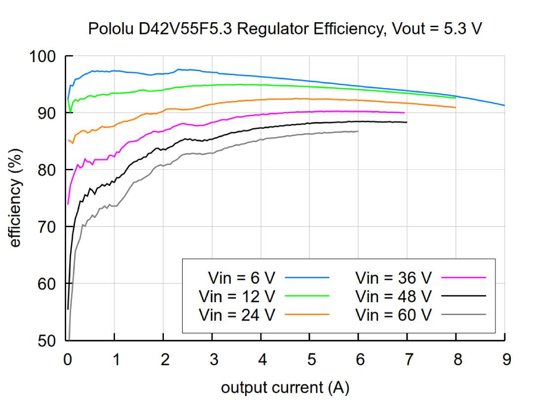 Przetwornica oferuje wysoką sprawność w zakresie od 70% do 95%, co pozwala znacząco ograniczyć straty energii i emisję ciepła. Najwyższa efektywność osiągana jest przy optymalnym obciążeniu i umiarkowanym napięciu wejściowym. Maksymalny ciągły prąd wyjściowy wynosi do 6 A, jednak jego rzeczywista wartość zależy od warunków pracy, takich jak napięcie wejściowe, temperatura otoczenia oraz sposób chłodzenia. Przy wyższych napięciach wejściowych dostępny prąd może ulegać zmniejszeniu ze względu na ograniczenia termiczne.
