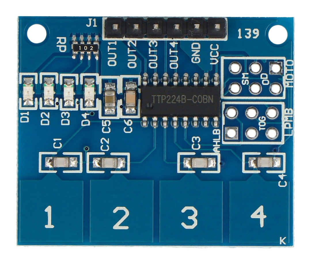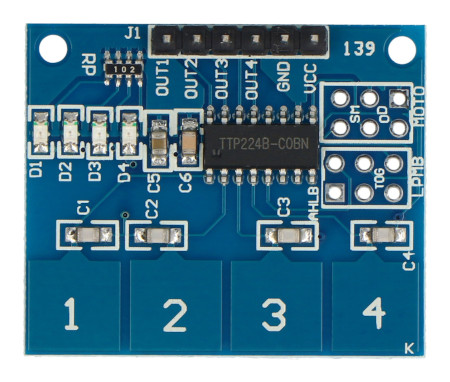 Pojemnościowy czujnik dotyku oparty na module TTP224. Zasilany jest napięciem od 2,4 V do 5,5 V, Wyjściem jest sygnał cyfrowy. Posiada 4 przyciski z sygnalizacją za pomocą diody LED.