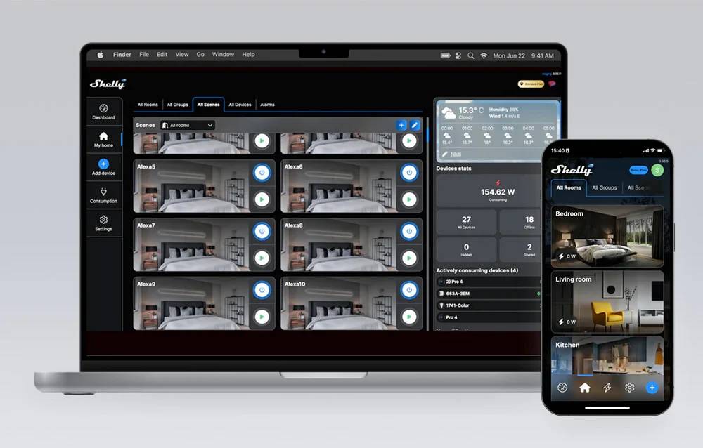 Shelly 3EM-63W Gen3 może pracować zarówno lokalnie w sieci WiFi, jak i zdalnie poprzez integrację z chmurą lub zewnętrznymi systemami automatyki. Obsługuje protokoły takie jak MQTT, HTTP oraz WebSocket, co pozwala na elastyczne zastosowanie zarówno w prostych domowych instalacjach, jak i zaawansowanych systemach zarządzania energią w firmach. Dzięki szyfrowaniu TLS zapewnia bezpieczną transmisję danych, chroniąc przed nieautoryzowanym dostępem. Urządzenie wyposażono również w interfejs WWW, który umożliwia lokalne monitorowanie i konfigurację bez potrzeby dostępu do Internetu. Dodatkowo, Shelly Smart Control pozwala wygodnie zarządzać danymi i tworzyć automatyzacje z poziomu aplikacji mobilnej lub przeglądarki.