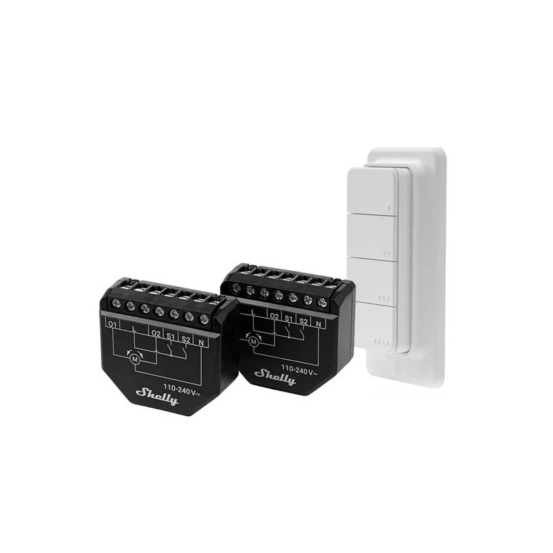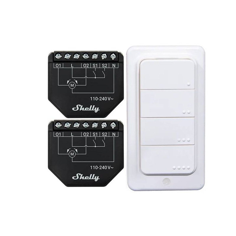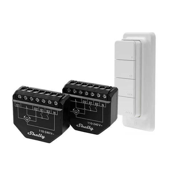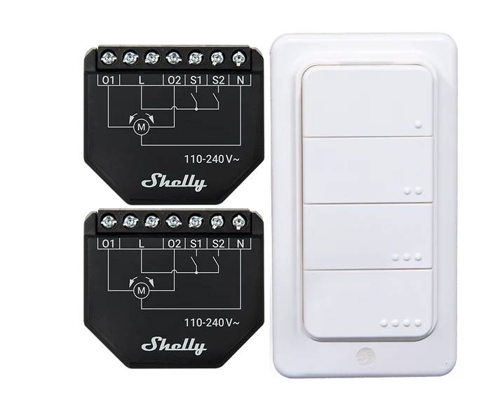 Opis produktu: Shelly Shutter + BLU RC Button 4 - 2x sterownik rolet + pilot aktywacji akcji i scen - WiFi / Bluetooth