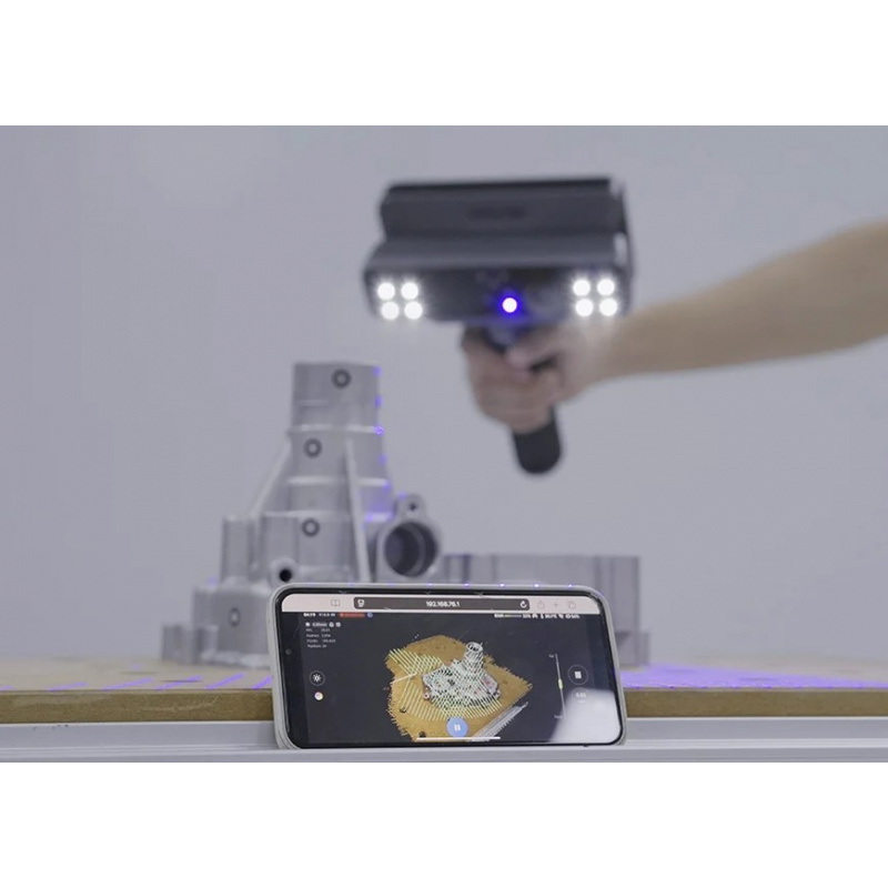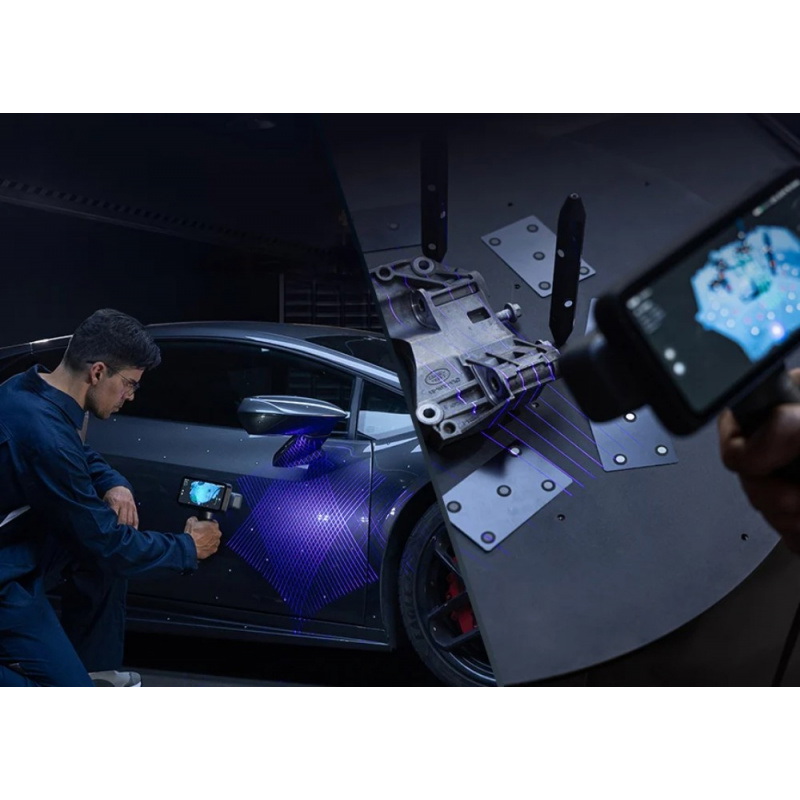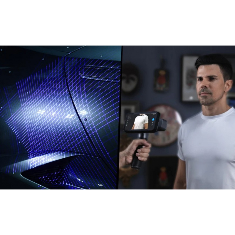 EinScan Rigil wykorzystuje podwójne źródło światła - niebieskie linie laserowe oraz podczerwień VCSEL.
