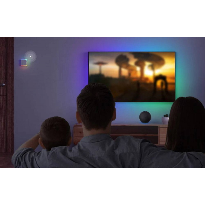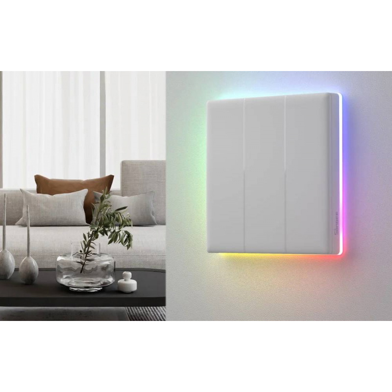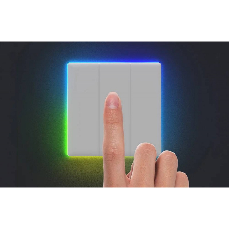 Przełącznik został wyposażony w duży panel dotykowy z trzema przyciskami, który zajmuje niemal całą powierzchnię frontu. Dzięki temu obsługa urządzenia jest intuicyjna i wygodna - wystarczy lekkie dotknięcie, aby włączyć lub wyłączyć światło. Krawędzie panelu otacza inteligentne podświetlenie LED, które sygnalizuje stan urządzenia oraz może pełnić funkcję dekoracyjnego oświetlenia. Do wyboru jest 8 różnych trybów podświetlenia, między innymi Night Light, Party czy Color. Wbudowane efekty świetlne pozwalają dopasować atmosferę w pomieszczeniu do aktualnej sytuacji. Dodatkowo po dotknięciu panelu pojawia się delikatne podświetlenie, sygnał dźwiękowy oraz subtelna wibracja, co potwierdza wykonanie polecenia nawet w ciemnym pomieszczeniu.