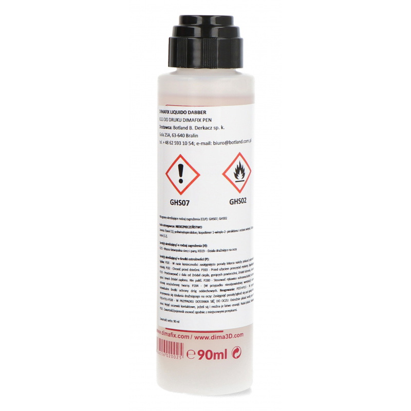 Preparat poprawiający przywieranie wydruków 3D do szklanej powierzchni hotbed. Produkt do stosowania w drukarkach wykorzystujących technologię FFF/FDM. Przeznaczony do pracy z większością typów filamentów dostępnych na rynku. Wykazuje właściwości adhezyjne w temperaturze powyżej 50°C. Produkt znajduje się w wygodnej w użyciu butelce o pojemności 90 ml. Dimafix Pen nanosi się, rozsmarowując cienko powłokę adhezyjną na szklanej powierzchni stołu roboczego za pomocą gąbki, znajdującej się na końcu szyjki butelki.