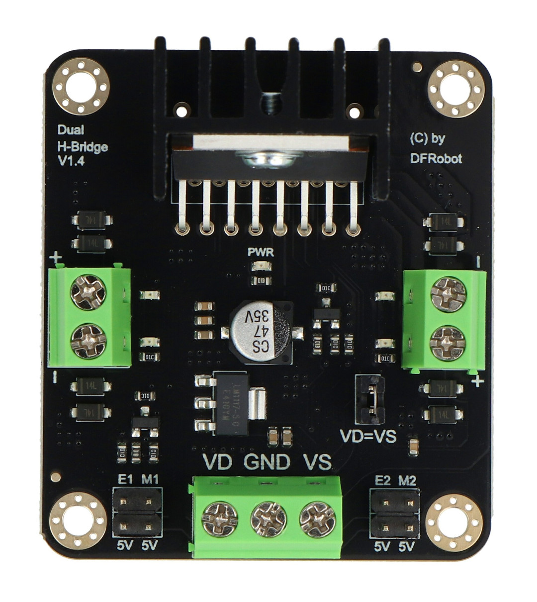 Dwukanałowy sterownik silników prądu stałego oparty o układ L298N, który umożliwia kontrolę kierunku obrotów i prędkości. Dzięki złączom śrubowym ARK zasilanie, oraz same silniki można w prosty sposób podłączyć przykręcając przewody przy pomocy wkrętaka. Sygnały sterujące zostały wyprowadzane na popularne złącza goldpin, co pozwala łączyć układ z płytkami uruchomieniowymi, np. z Arduino za pomocą przewodów.