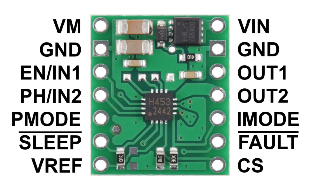 - EN / IN1, PH / IN2: wejścia sterujące w trybie phase / enable