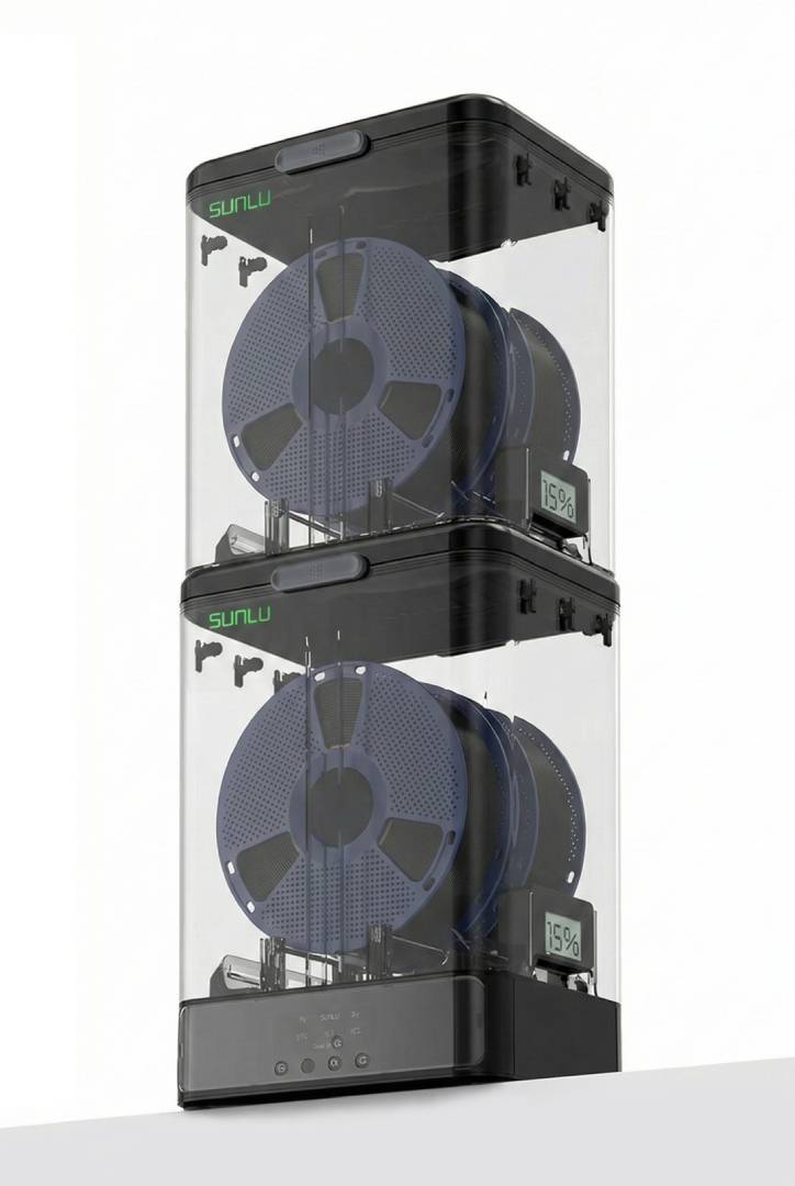 Sunlu FilaDryer SP2 Set to praktyczne rozwiązanie 2w1, które łączy funkcję suszarki do filamentów 3D ze szczelnym pojemnikiem do ich przechowywania. Modułowa konstrukcja pozwala oddzielić bazę grzewczą od boxa, a sam pojemnik może pracować również jako niezależny magazyn filamentu. Urządzenie oferuje zakres temperatur suszenia od 35°C do 70°C, co ułatwia dopasowanie parametrów do większości popularnych materiałów i warunków pracy. Duża komora umożliwia suszenie i przechowywanie szpul o wymiarach do 250 x 153 mm, w konfiguracji 2 x 1 kg, 1 x 2 kg lub 1 x 3 kg (w zależności od konstrukcji szpuli). Dodatkowo box ma wbudowany higrometr do kontroli wilgotności, a otwory wyjściowe filamentu pozwalają drukować bez otwierania komory, ograniczając ryzyko ponownego zawilgocenia.