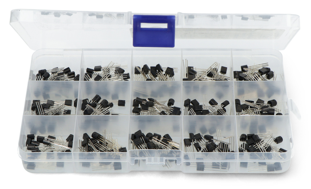 Komplet tranzystorów bipolarnych NPN i PNP. W zestawie znajduje się 15 różnych typów po 20 sztuk każdy, co daje łącznie 300 tranzystorów. Wszystkie elementy umieszczone są w kompaktowym, przezroczystym organizerze, który ułatwia pracę i pozwala utrzymać porządek na stanowisku. Dodatkowo każdy tranzystor posiada nadruk z oznaczeniem, co ułatwia szybkie rozpoznanie rodzaju elementu.