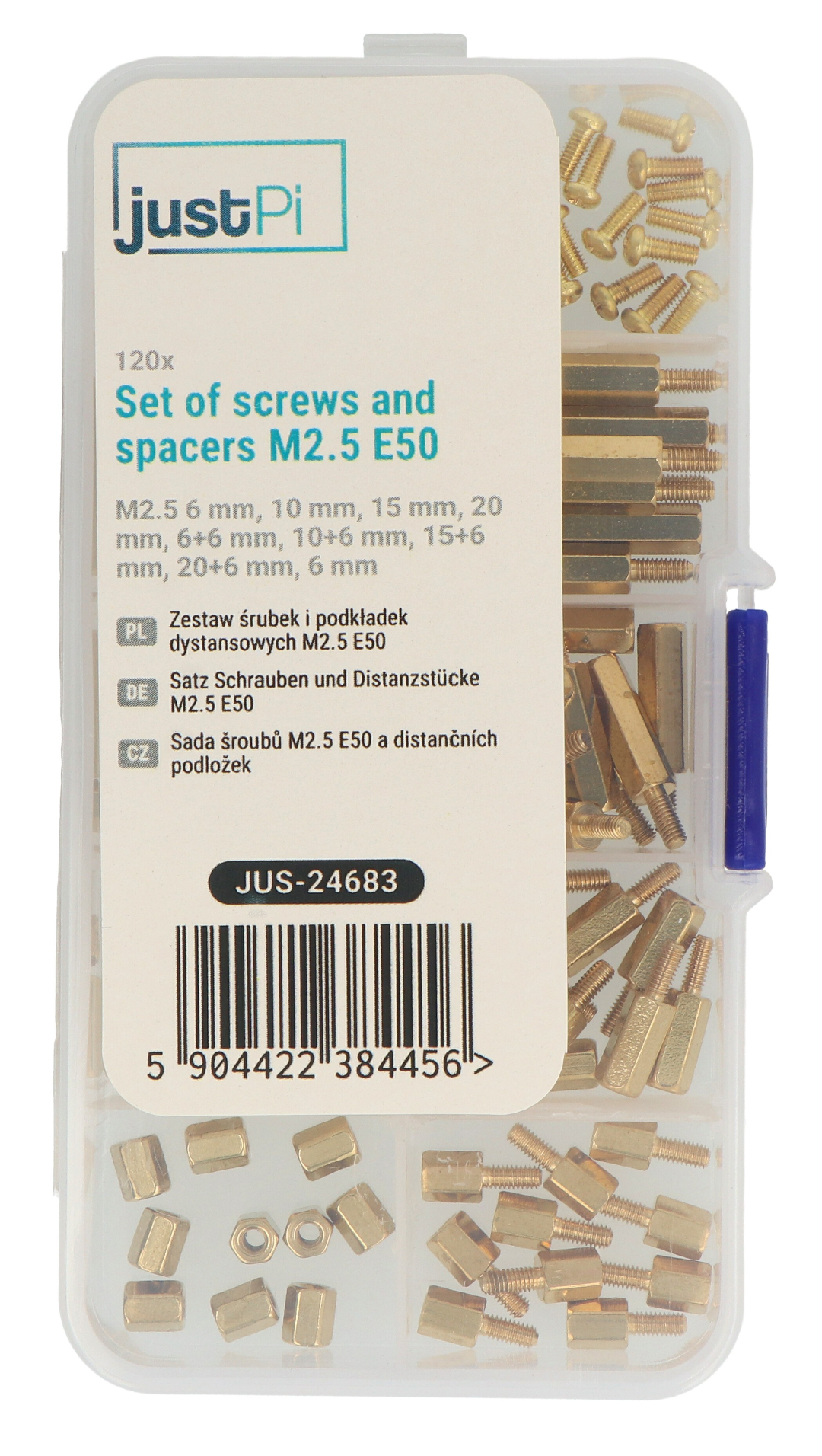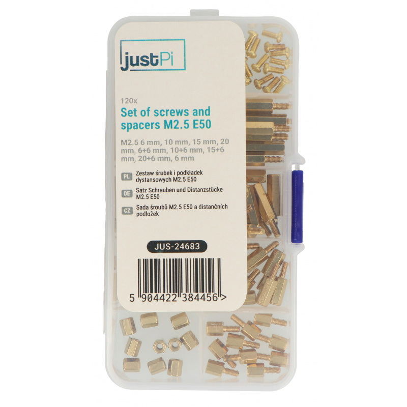 Opis produktu: Zestaw śrubek i podkładek dystansowych M2,5 E50 - 120 szt. - justPi