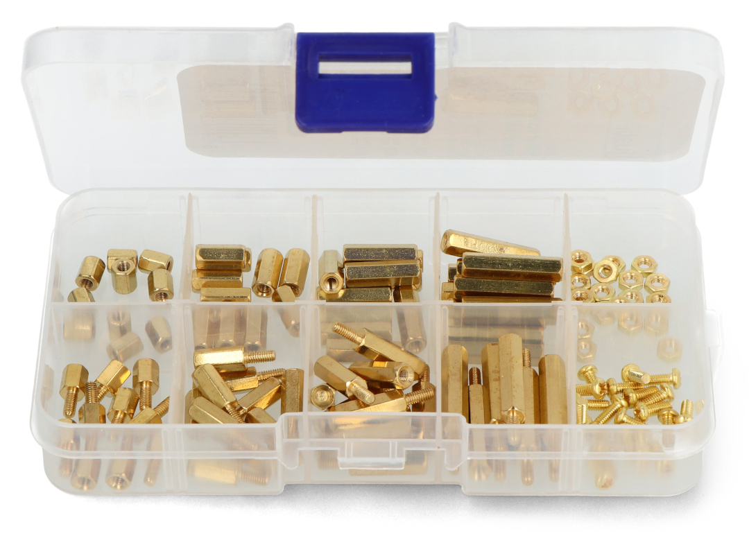 Komplet obejmuje śruby M2,5, nakrętki oraz różnej długości tuleje dystansowe. Zestaw znakomicie sprawdza się podczas montażu płytek drukowanych i elementów elektronicznych, zapewniając estetyczne i stabilne mocowanie. Całość została umieszczona w praktycznym organizerze, który ułatwia przechowywanie i szybki dostęp do potrzebnych elementów.