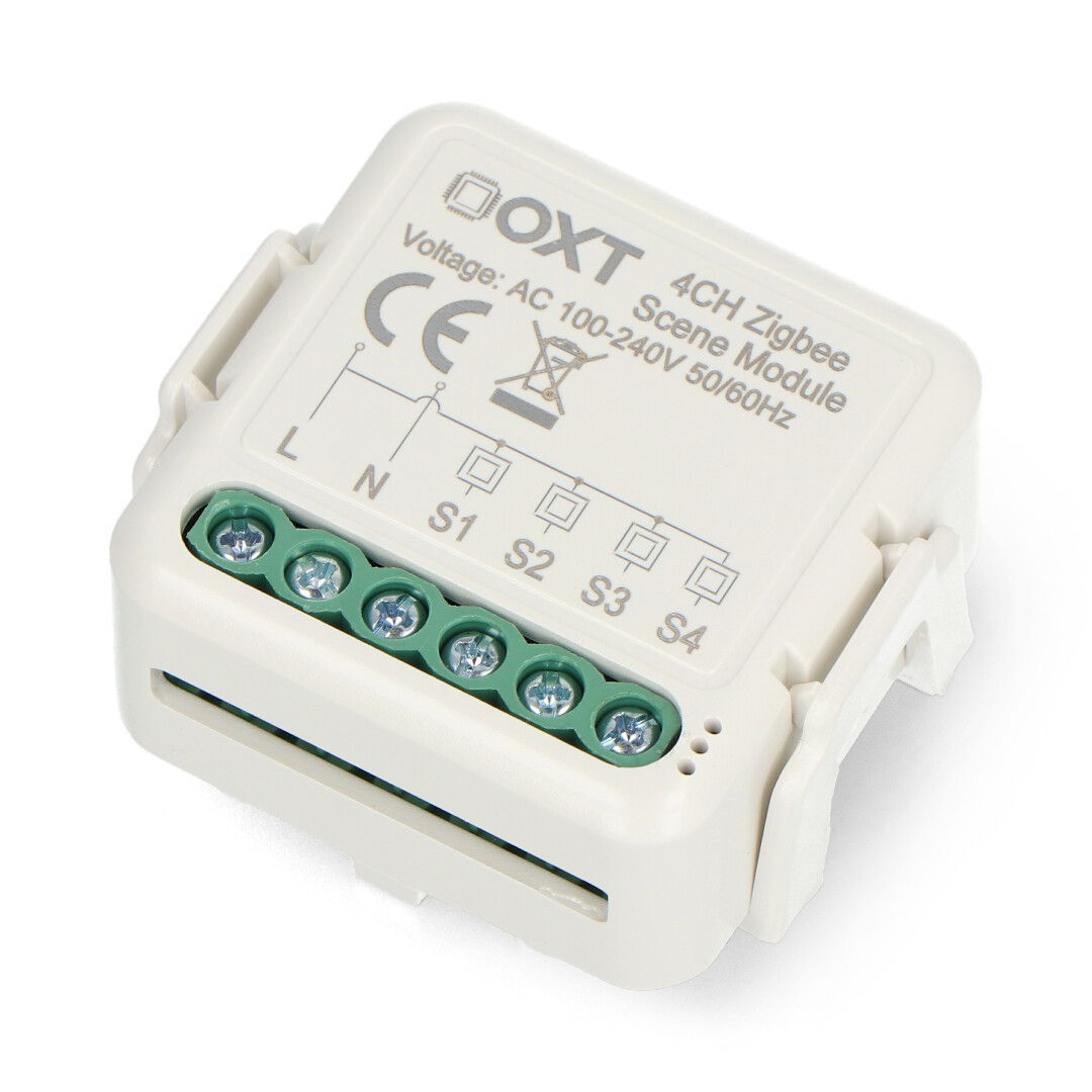 Moduł OXT działa w standardzie ZigBee 3.0, co zapewnia bardzo szybki czas reakcji (ok. 0,2 s), niski pobór energii oraz możliwość pracy w topologii mesh. Urządzenie współpracuje z aplikacjami Tuya Smart oraz Smart Life, umożliwiając pełną konfigurację, przypisywanie scen oraz automatyzacji. Do działania wymaga centralki ZigBee. Każdy przycisk może obsłużyć trzy różne akcje: kliknięcie, podwójne kliknięcie i przytrzymanie, co daje aż 12 programowalnych scen w jednym urządzeniu. Sceny mogą być uruchamiane ręcznie lub automatycznie, np. o konkretnej godzinie, przy zmianie temperatury czy po wykryciu ruchu.