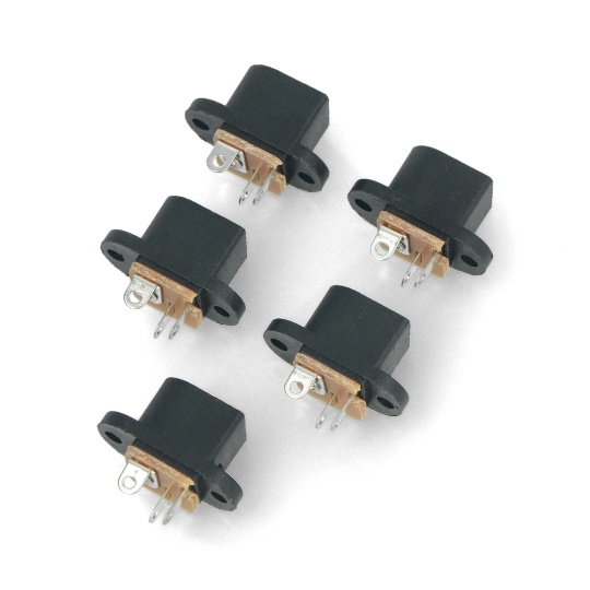 W zestawie znajdziesz pięć sztuk gniazd DC 5,5 / 2,1 mm przeznaczonych do montażu na obudowach urządzeń elektronicznych. Każde gniazdo osadzone jest w osłonce z otworami montażowymi, które umożliwiają przykręcenie do obudowy.