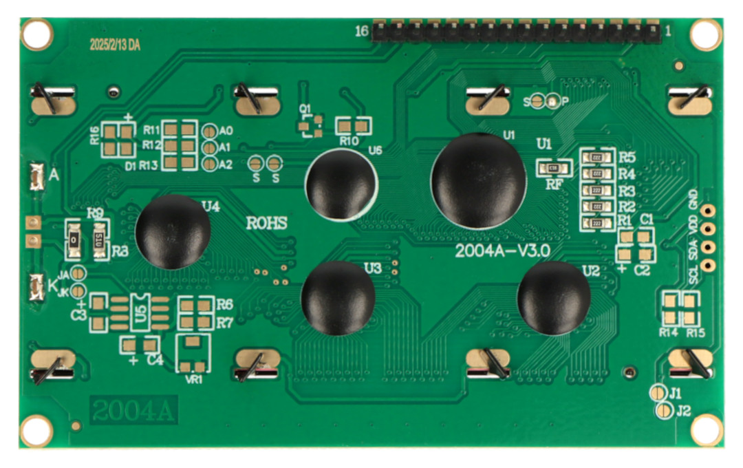 Wyświetlacz alfanumeryczny LCD marki justPi. Pokazuje wartości w czterech liniach, po 20 znaków w każdej. Zasilany jest napięciem 5 V. Charakteryzuje się wyjątkowo prostą obsługą. Można go używać z wieloma mikrokontrolerami, a w szczególności z Arduino. Znaki wyświetlane są na niebieskim tle. Moduł posiada dodatkowo wlutowane złącza. Sterownik zgodny z HD44780.