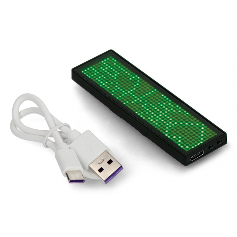 LED Name Tag to elektroniczny identyfikator z zielonym wyświetlaczem LED, pozwalający na dynamiczne prezentowanie imienia, stanowiska, hasła reklamowego lub dowolnej wiadomości. Dzięki matrycy 11 x 44 punktów LED urządzenie oferuje czytelny i wyraźny tekst nawet w dobrze oświetlonych pomieszczeniach. Plakietka obsługuje wiele trybów wyświetlania, takich jak przewijanie w różnych kierunkach, miganie, stałe wyświetlanie, animacje czy efekt ramki świetlnej. Użytkownik może zapisać do 8 wiadomości o długości ponad 200 znaków każda. Konfiguracja odbywa się poprzez przewód micro USB z poziomu komputera lub aplikacji mobilnej.