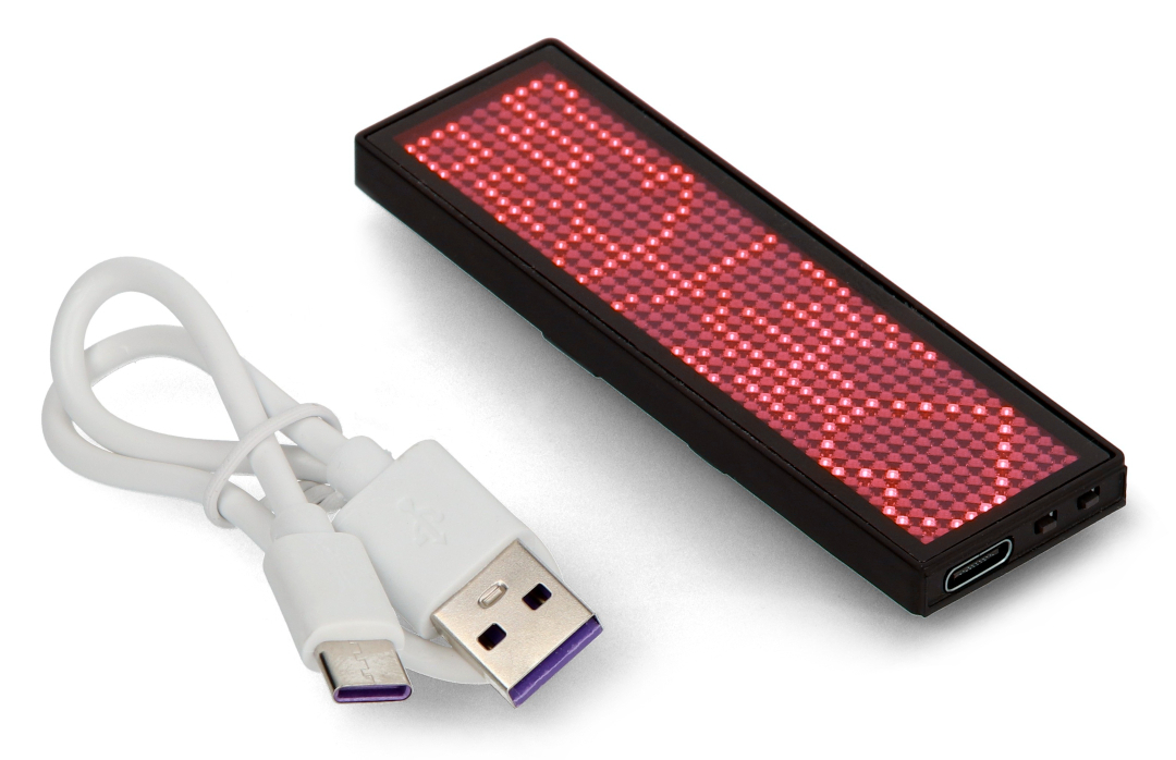 LED Name Tag to elektroniczny identyfikator z czerwonym wyświetlaczem LED, pozwalający na dynamiczne prezentowanie imienia, stanowiska, hasła reklamowego lub dowolnej wiadomości. Dzięki matrycy 11 x 44 punktów LED urządzenie oferuje czytelny i wyraźny tekst nawet w dobrze oświetlonych pomieszczeniach. Plakietka obsługuje wiele trybów wyświetlania, takich jak przewijanie w różnych kierunkach, miganie, stałe wyświetlanie, animacje czy efekt ramki świetlnej. Użytkownik może zapisać do 8 wiadomości o długości ponad 200 znaków każda. Konfiguracja odbywa się poprzez przewód micro USB z poziomu komputera lub aplikacji mobilnej.
