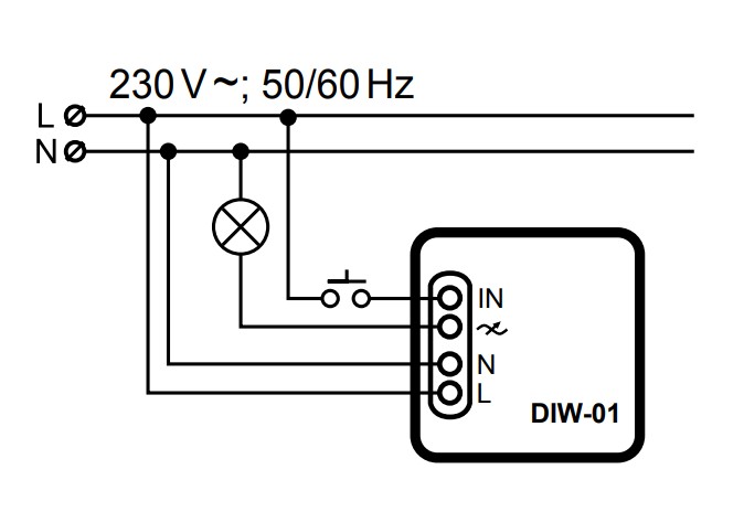 Instalacja DIW-01 jest intuicyjna i szybka dzięki przejrzystemu schematowi podłączenia. Ściemniacz przeznaczony jest do montażu w klasycznej puszce instalacyjnej Ø60 mm. Cztery zaciski przyłączeniowe umożliwiają łatwe podłączenie przewodów o przekroju do 2,5 mm². Napięcie zasilania 230 V AC i wbudowane zabezpieczenia zapewniają bezpieczną eksploatację. Ściemniacz współpracuje z włącznikami monostabilnymi oraz bistabilnym, dając wszechstronność w konfiguracji.