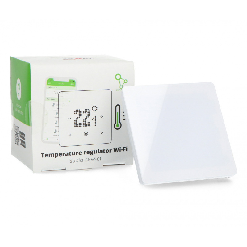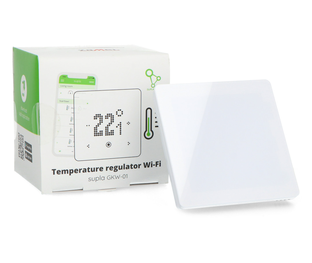 GKW-01 od firmy Zamel Supla to nowoczesny regulator temperatury, który pozwala na łatwą kontrolę temperatury w pomieszczeniu i sterowanie systemami grzewczymi, takimi jak ogrzewanie podłogowe czy grzałki elektryczne. Dzięki połączeniu za pomocą sieci WiFi z aplikacją Supla, umożliwia zdalne ustawianie temperatury, a także programowanie jej na podstawie harmonogramu tygodniowego. Wyświetlacz matrycowy LED oferuje automatyczną regulację jasności w zależności od oświetlenia w pomieszczeniu. Wbudowany przekaźnik o obciążeniu do 16 A pozwala na sterowanie grzałkami elektrycznymi i zaworami. GKW-01 oferuje także możliwość podłączenia zewnętrznych czujników, takich jak czujnik otwarcia okna czy czujnik temperatury NTC.