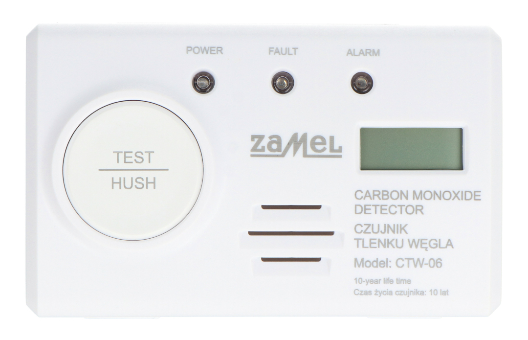 Czujnik tlenku węgla Zamel CTW-06 wykorzystuje elektrochemiczny sensor, który reaguje na obecność tlenku węgla w powietrzu. Gdy stężenie czadu osiągnie poziom niebezpieczny, urządzenie uruchamia alarm dźwiękowy oraz migającą sygnalizację optyczną. Poziomy zadziałania są zgodne z normą PN-EN50291-1:2018, co oznacza reakcję przy stężeniach 30 ppm w czasie powyżej 120 minut, 100 ppm w czasie od 10 do 40 minut oraz 300 ppm w czasie do 3 minut. W trybie normalnej pracy wyświetlacz LCD prezentuje stan naładowania baterii, naprzemiennie stężenie tlenku węgla oraz temperaturę. Autodiagnostyka kontroluje kondycję sensora oraz stopień zużycia urządzenia, sygnalizując błędy, rozładowanie baterii oraz koniec okresu eksploatacji.