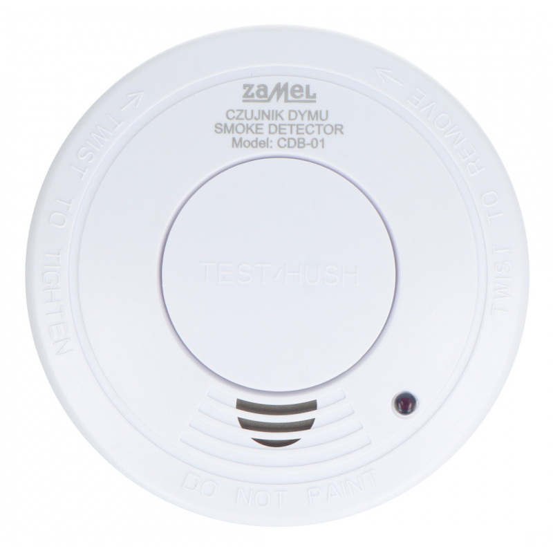 Czujnik dymu Zamel CDB-01 wykorzystuje technologię fotoelektryczną, która wykrywa dym na podstawie zmiany rozproszenia światła w komorze pomiarowej. W momencie, gdy do wnętrza czujnika wtargnie dym, urządzenie uruchamia alarm dźwiękowy 85 dB oraz migającą diodę LED. Przycisk TEST / HUSH umożliwia sprawdzanie poprawności działania oraz wyciszenie alarmu w razie fałszywego zadziałania. Układ monitoruje stan baterii i sygnalizuje konieczność jej wymiany krótkimi sygnałami dźwiękowymi. Dzięki zasilaniu bateryjnemu czujnik działa nawet podczas zaniku zasilania w instalacji budynku.
