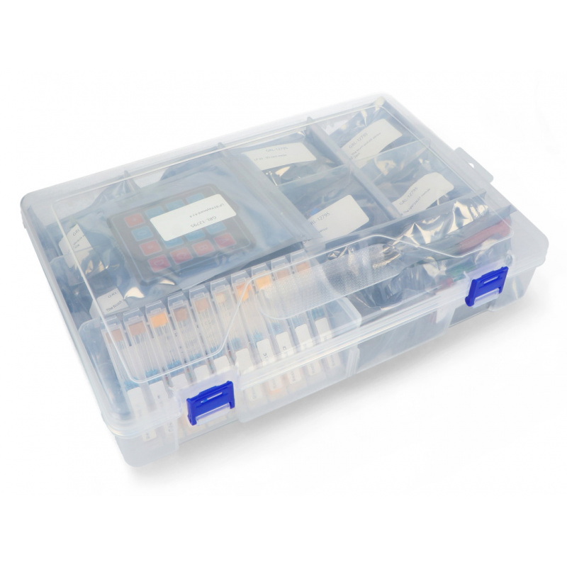 Zestaw czujników dla Arduino i Raspberry Pi składający się z 65 elementów. W skład zestawu wchodzi m.in. czujnik temperatury i wilgotności, czujnik wilgotności gleby, czujnik dymu, wyświetlacz, przekaźnik i wiele więcej. Całość zamknięta została w pojemniku.