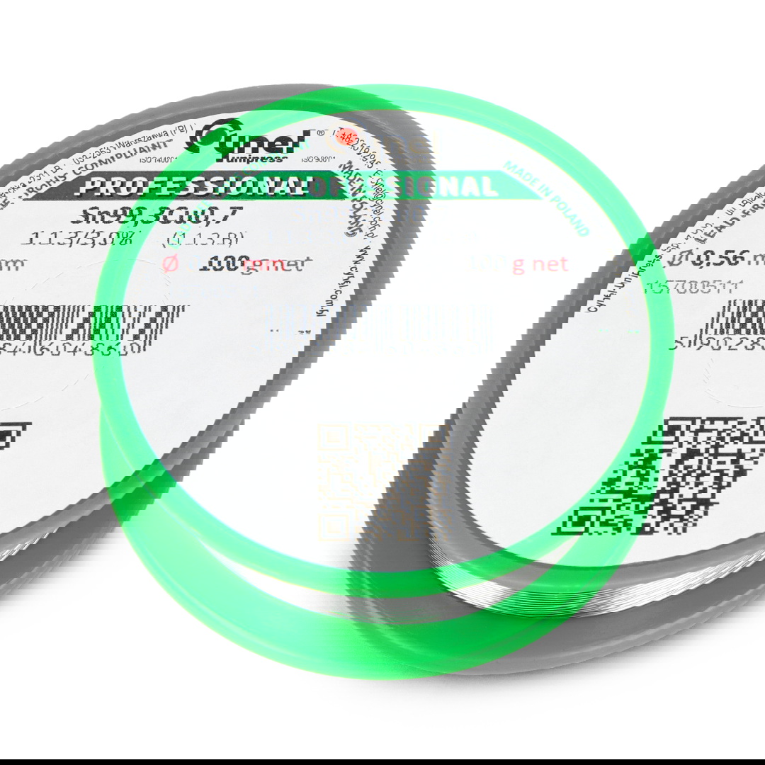 Spoiwo lutownicze w postaci bezołowiowej cyny LC99.3 o średnicy 0,56 mm w szpuli o masie 100 g. |
