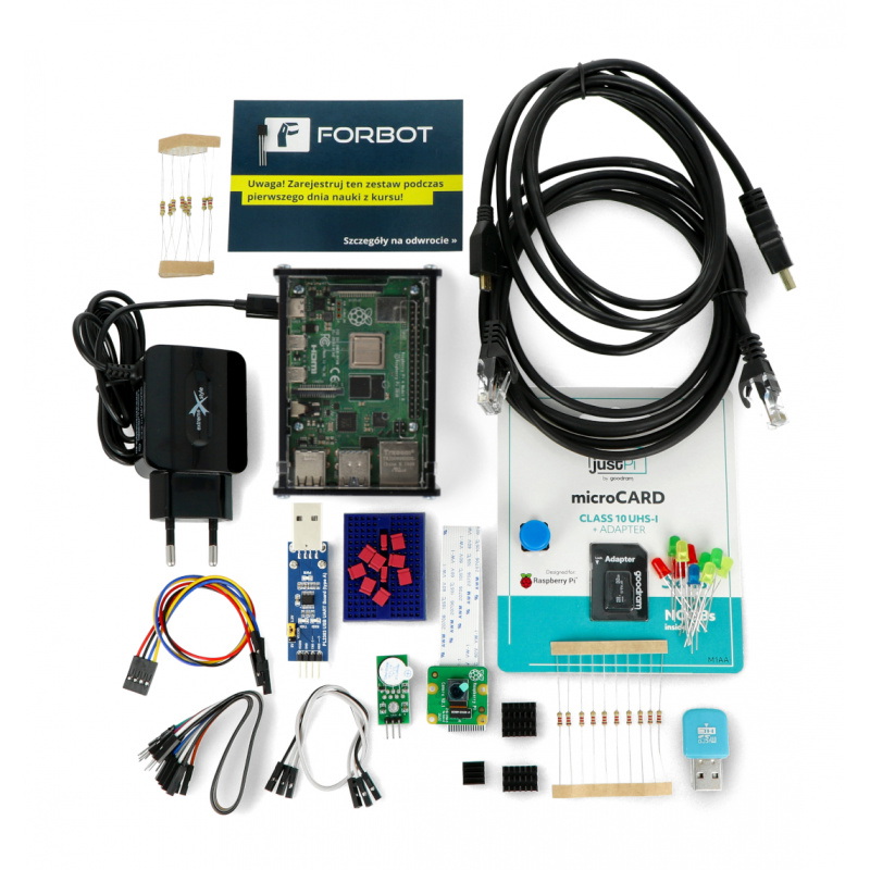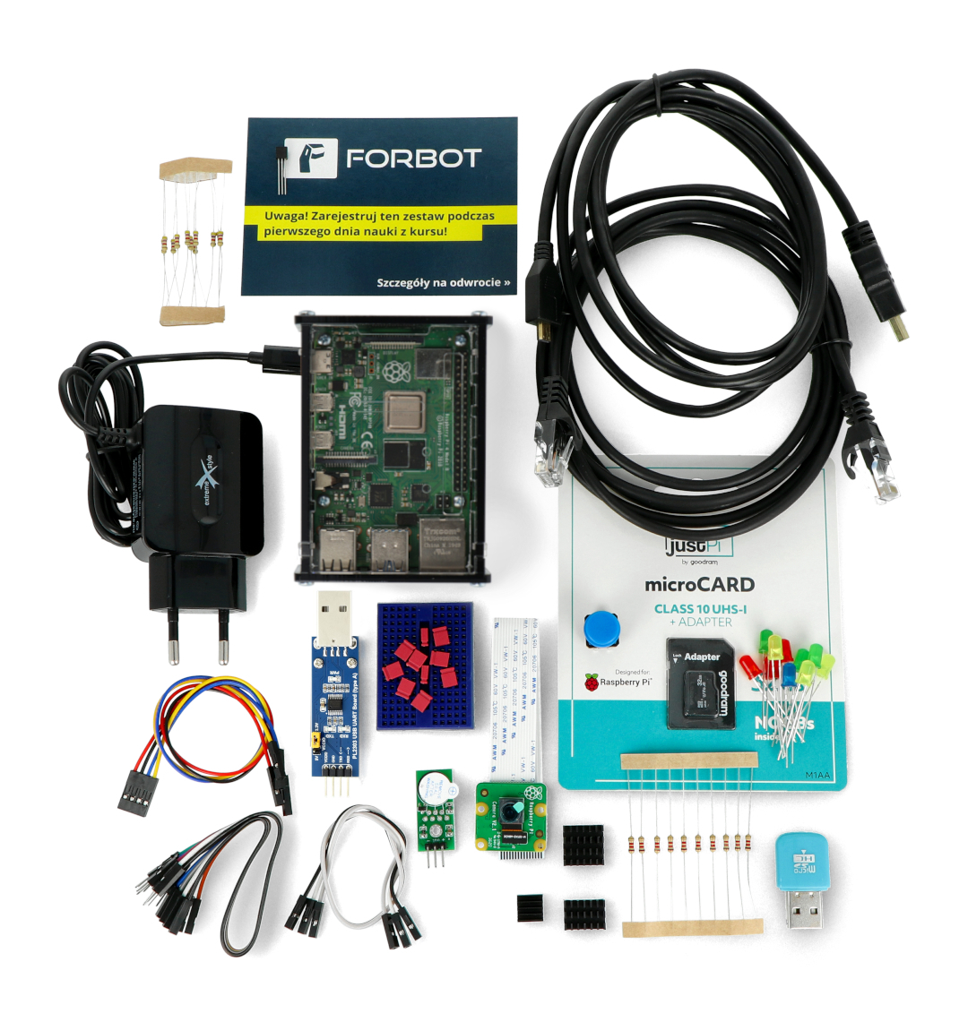 W zestawie znajduje się m.in. najnowsze Raspberry Pi 4B w wersji 8 GB, karta pamięci (32 GB klasa 10) wraz z czytnikiem, zasilacz z USB typu C (5,1 V 3 A), uniwersalna obudowa, konwerter USB / UART, przewód sieciowy oraz zestaw radiatorów, oryginalna kamera Raspberry Pi HD (8 Mpx), przewód HDMI - microHDMI, mała płytka stykowa, przewody połączeniowe oraz komplet elementów elektronicznych (diody, rezystory, moduł buzzera, przycisk, czujnik temperatury). Wszystkie te elementy wykorzystane są w ćwiczeniach praktycznych dotyczących GPIO.