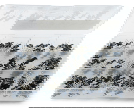 - Zestaw zawiera 120 sztuk kondensatorów elektrolitycznych o różnych pojemnościach i napięciach