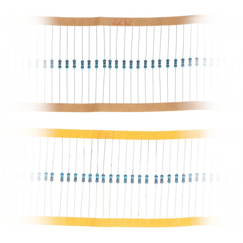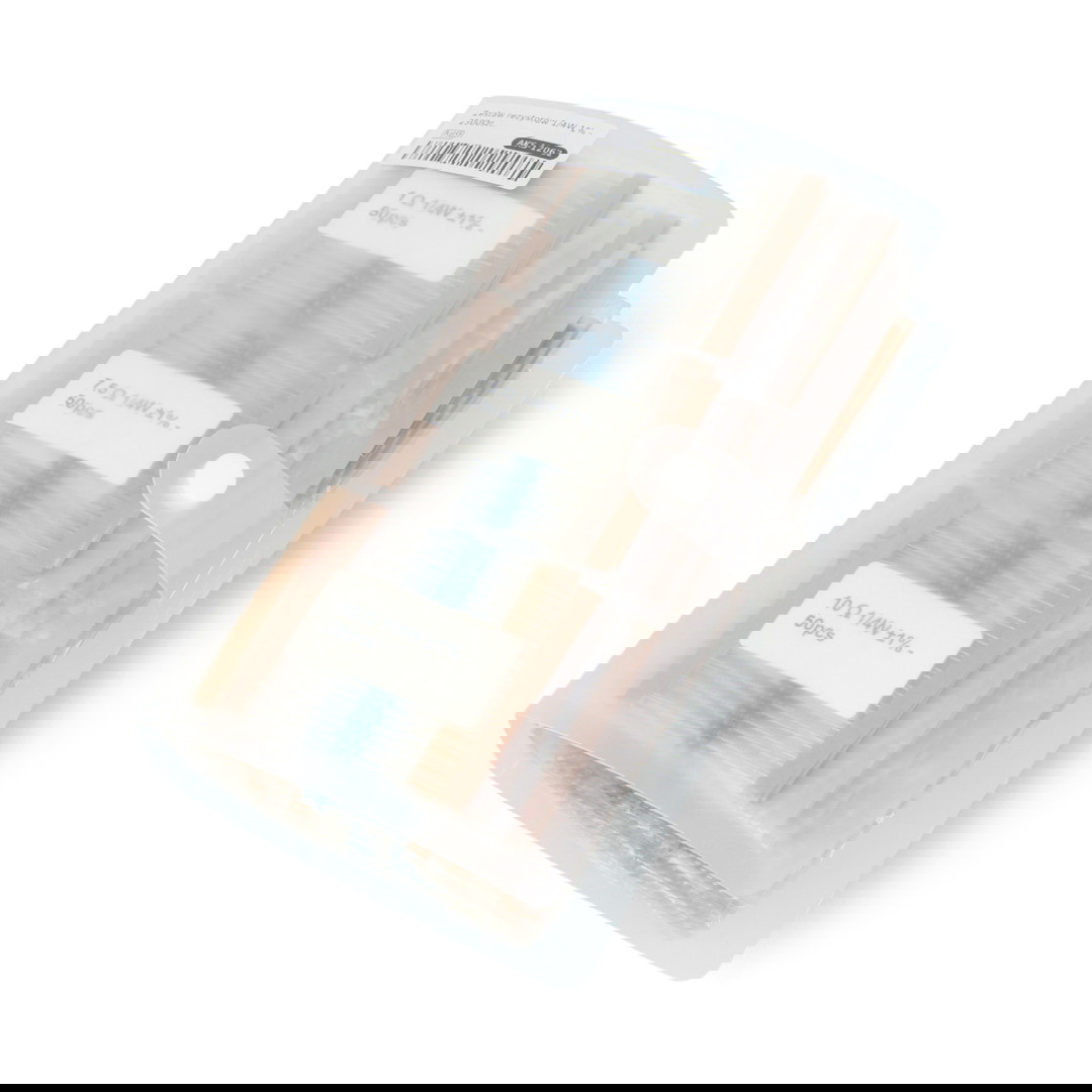 Zestaw 50 wartości rezystorów węglowych 0,25 W o tolerancji 1%, po 50 sztuk każdej. Elementy są podpisane, co ułatwia odnalezienie odpowiedniej wartości. W skład zestawu wchodzą następujące wartości: