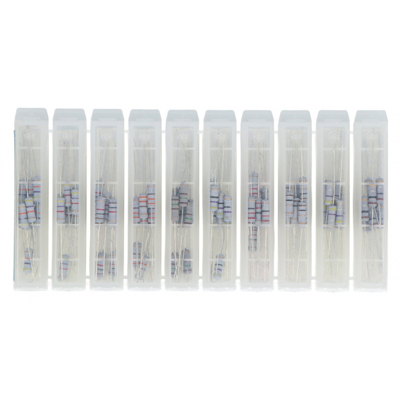 Zbiór 10 popularnych wartości rezystorów przewlekanych 1 o tolerancji 5 %. W celu ułatwienia odnalezienia właściwej wartości, każda z nich znajduje się w odpowiednio oznaczonej przegrodzie organizera.