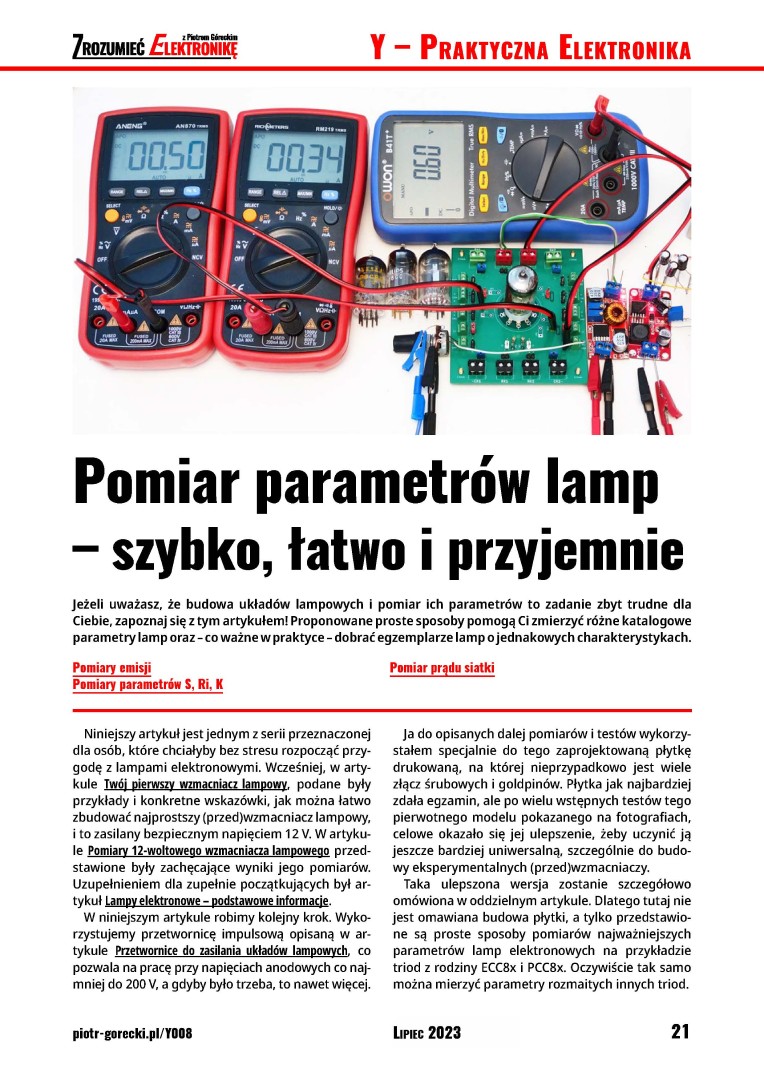 Okładkowy projekt tego numeru potwierdza, że tak pożądana przez wielu Czytelników tematyka lamp elektronowych jest i będzie kontynuowana. Projekt okładkowy pokazuje, jak w bardzo prosty sposób można sprawdzić, czy parametry danej triody zgadzają się z katalogiem. W tym numerze zamieszczony jest też artykuł zakwalifikowany do kategorii Audio, zatytułowany: Czego tak naprawdę oczekujemy od lamp?