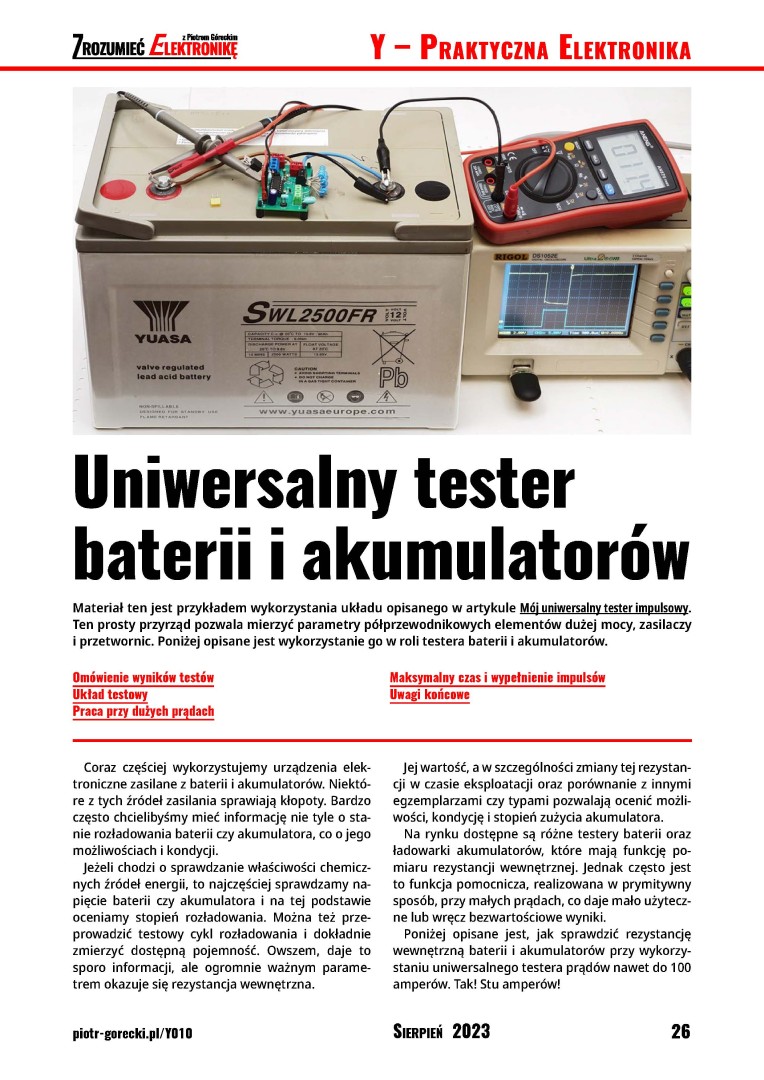 Drugim bardzo ważnym projektem tego numeru jest Uniwersalny tester baterii i akumulatorów. To przykład wykorzystania impulsowego testera, który był przedstawiony w poprzednim numerze czasopisma. Teraz szczegółowo przedstawiam, jak można go wykorzystać do sprawdzania najróżniejszych baterii i akumulatorów.