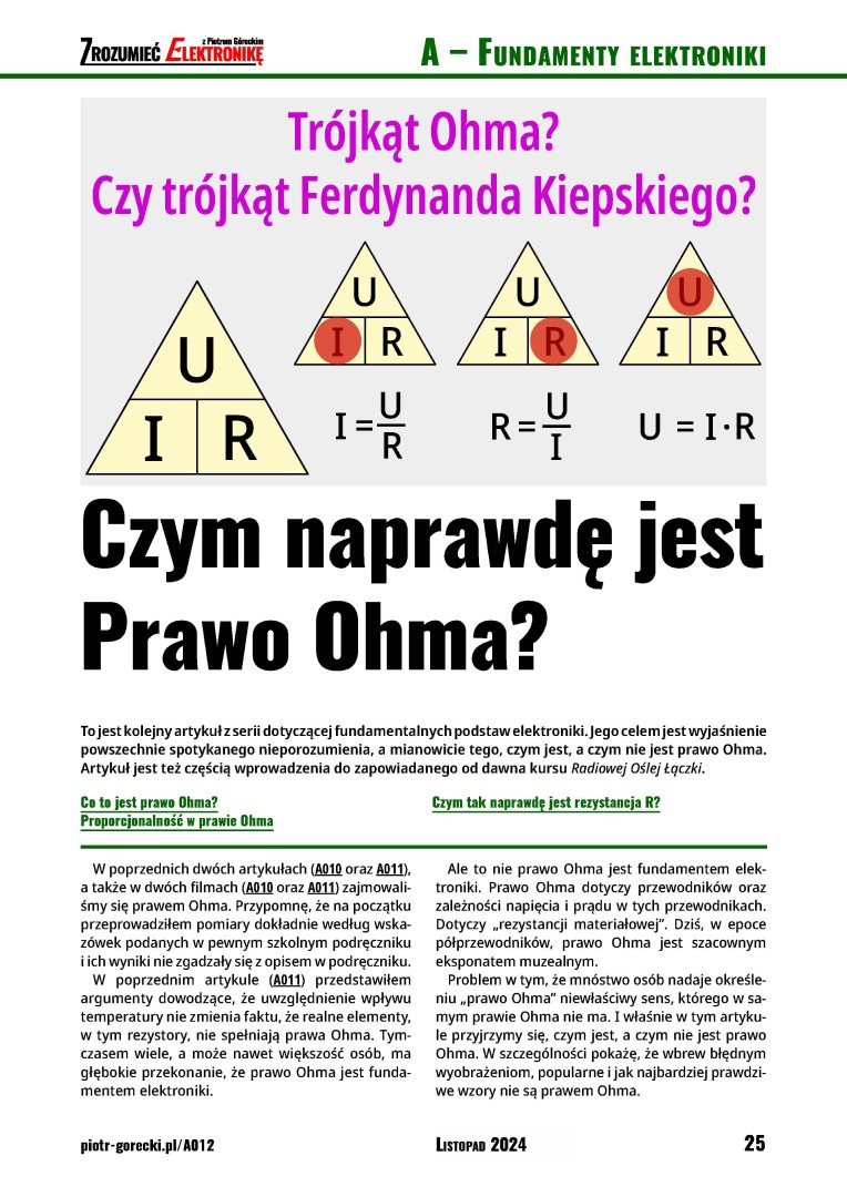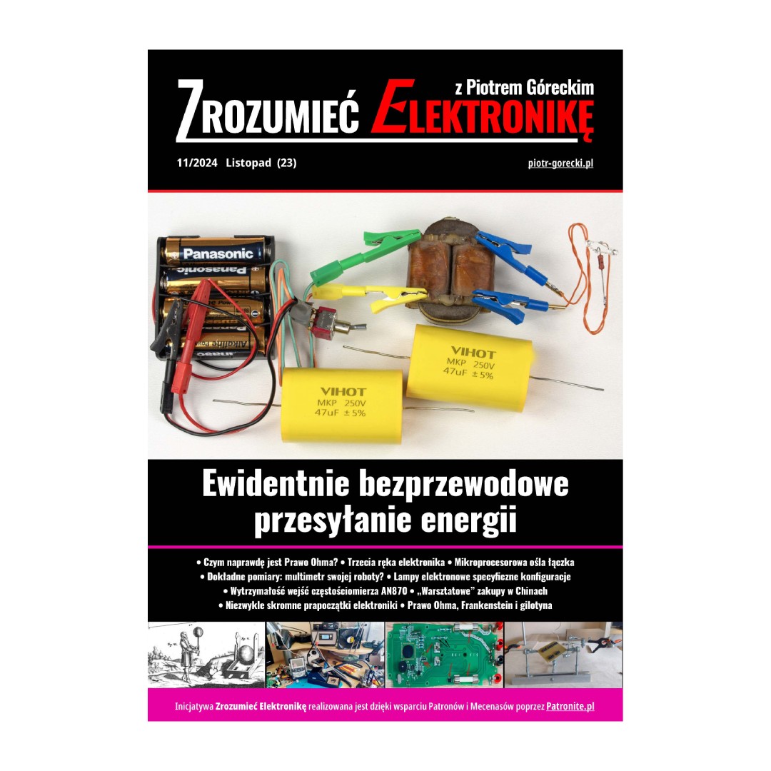 Zrozumieć Elektronikę to cyfrowy miesięcznik dla pasjonatów elektroniki, autorstwa Piotra Góreckiego. Projekt okładkowy numeru listopadowego to „Ewidentnie bezprzewodowe przesyłanie energii”. Kolejna część cyklu Radiowej Oślej Łączki, pokazująca, że wbrew potocznym i powszechnym wyobrażeniom, energia elektryczna zawsze przekazywana jest bezprzewodowo. Ponieważ przed pokazaniem pięknych i nietrudnych podstaw techniki radiowej trzeba przygotować grunt i wyprostować powszechne błędne przekonania warto przeczytać artykuł: „Czym naprawdę jest prawo Ohma?”, materiał o bardzo skromnych prapoczątkach elektroniki, a także artykuł o… Frankensteinie, gilotynie i ich ścisłym związku z prawem Ohma. Warto też w artykule o dokładnych pomiarach przeanalizować niektóre aspekty kwestii, czy budowa multimetru swojej roboty ma sens. Godny polecenia jest również praktyczny temat: „Trzecia ręka elektronika”, omówiony w cyklu Wspólnie projektujemy. W numerze znajduje się też materiał o specyficznych konfiguracjach jednolampowych oraz szósty już artykuł serii Mikroprocesorowa Ośla Łączka. A na końcu ciekawy artykuł o zakupach „elektroniki” w Chinach. Numer ISSN czasopisma: 3071-7965.