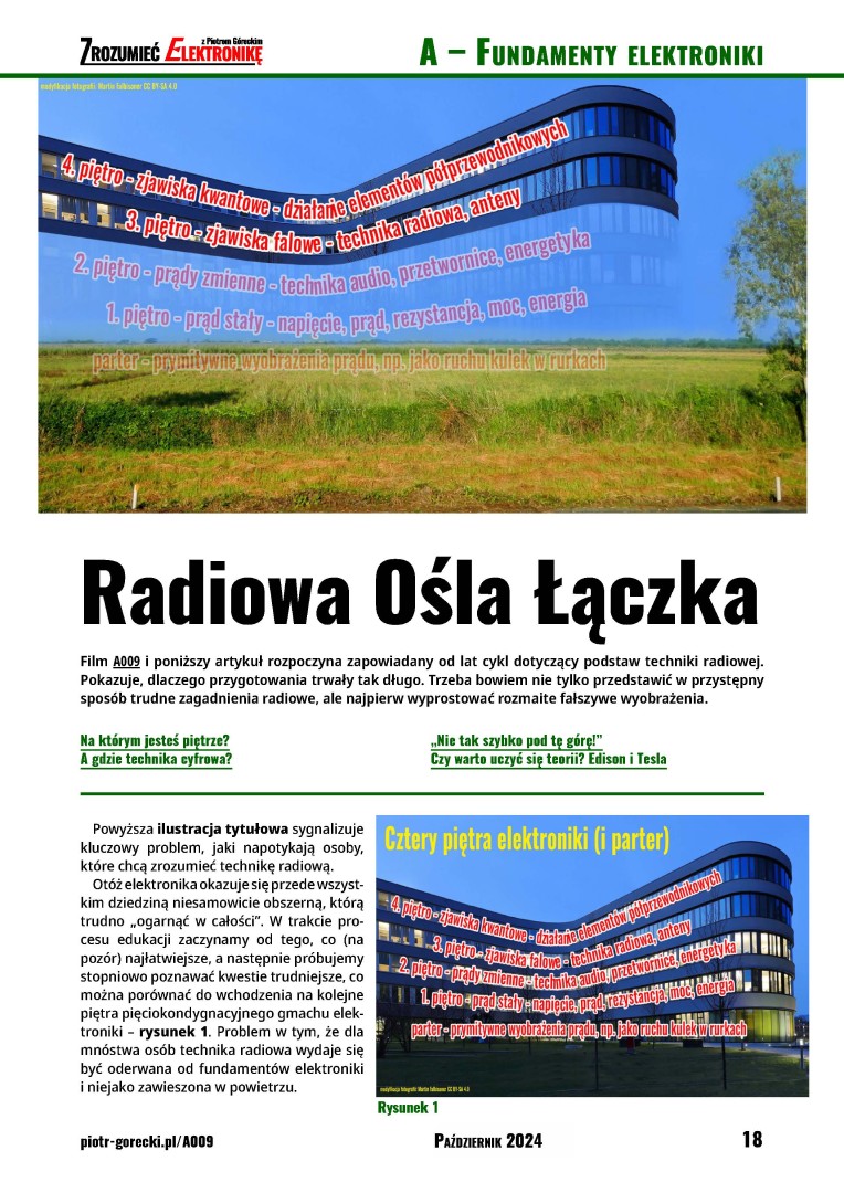 Z ogromną przyjemnością, ale też z pewnymi obawami informuję, że właśnie zaczynam zapowiadany od dawna cykl pod roboczą nazwą Radiowa Ośla Łączka. Wszystkie osoby, które mnie znają dłużej wiedzą, że prace nad Radiową Oślą Łączką rozpocząłem ładnych kilka lat temu. Prace te zostały zaburzone wskutek rozstania z EdW i konieczności założenia nowego czasopisma o wymownej nazwie Zrozumieć Elektronikę. Zamiaru oczywiście nie porzuciłem. Zgromadziłem sporo materiałów. Wstępnie przygotowałem też, ściśle z tym związany, elementarny kurs „Fascynujące przemiany energii” i czekam na skompletowanie (głównie w Chinach) zestawu do praktycznych ćwiczeń.