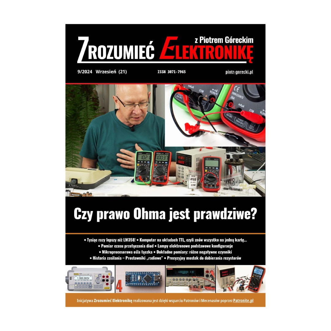 Zrozumieć Elektronikę to cyfrowy miesięcznik dla pasjonatów elektroniki, autorstwa Piotra Góreckiego. Projekt główny wydania wrześniowego to wprowadzenie do cyklu „Radiowej Oślej Łączki” - zaczynamy się krytycznie przyglądać prawu Ohma, bo fałszywe wyobrażenia związane z tym prawem są dużą przeszkodą w zrozumieniu kwestii radiowych. W numerze znajdziesz też ważny artykuł: Tysiąc razy lepszy niż LM358!, pokazujący możliwości, zalety i wady różnych odmian wzmacniaczy operacyjnych. Są też artykuły o bardzo dokładnym dobieraniu jednakowych rezystorów oraz o problemach związanych z dokładnymi pomiarami. Omówiono również prosty sposób pomiaru czasu przełączania diod. W cyklu Wspólnie projektujemy znajdziesz artykuł dotyczący projektowania zabezpieczeń w zasilaczach. Jest też czwarty artykuł cyklu Mikroprocesorowa Ośla Łączka. A w serii o lampach elektronowych omówiono podstawowe konfiguracje jednolampowe. I jeszcze artykuły o mało już dziś znanych dawnych prostownikach stosowanych w radioodbiornikach lampowych oraz o budowie komputera TTL. Numer ISSN czasopisma: 3071-7965.