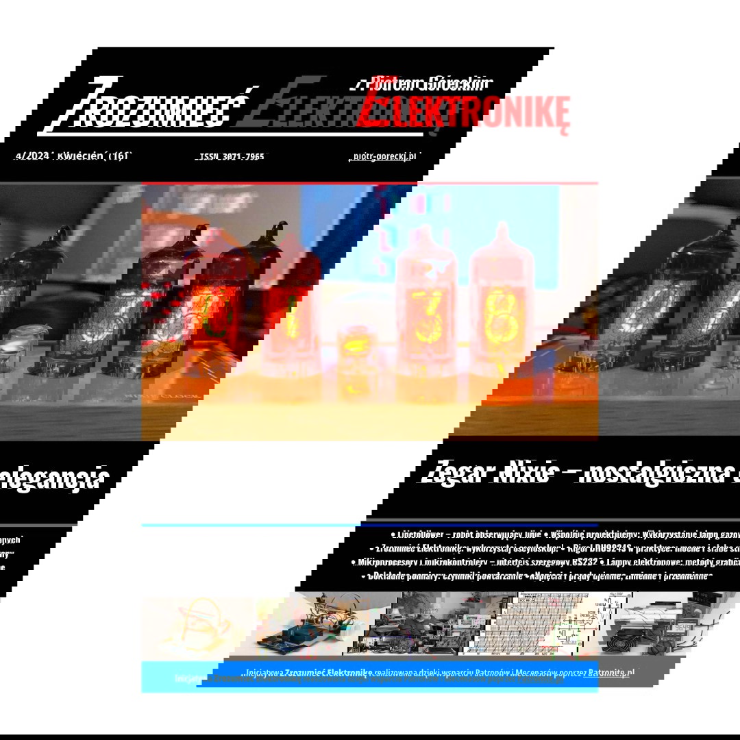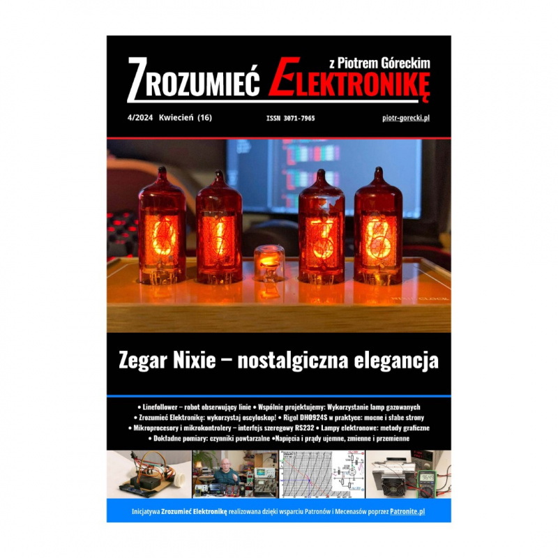 Zrozumieć Elektronikę to cyfrowy miesięcznik dla pasjonatów elektroniki, autorstwa Piotra Góreckiego. Projektem okładkowym w wydaniu kwietniowym jest zegar z kultowymi lampami Nixie. Uzupełnieniem jest drugi artykuł, który niejako „od kuchni” pokazuje różne aspekty realizacji tego rodzaju kultowego dziś wręcz zegara. Zaciekawienie wzbudzą też wszystkie inne artykuły tego numeru, w tym nieoczekiwany element primaaprilisowy. Warto zwrócić uwagę na bardzo interesujący artykuł na temat tajemniczych, słabo rozumianych modułów Peltiera i pokrewny materiał o realizacji naprawdę dobrego termostatu. Dla początkujących jest artykuł o napięciach i prądach ujemnych, zmiennych i przemiennych, a także artykuł: „Wykorzystaj oscyloskop”. Do tego drugi artykuł opisujący czterokanałowy oscyloskop o właściwościach profesjonalnych i cenie „półamatorskiej”. W serii o miernictwie na uwagę zasługuje artykuł o ważnych problemach utrudniających naprawdę dokładne pomiary i o tym jak te pułapki ominąć. Numer zawiera też materiał o metodach graficznych oraz projekt prostego robota typu Linefollower. Numer ISSN czasopisma: 3071-7965.