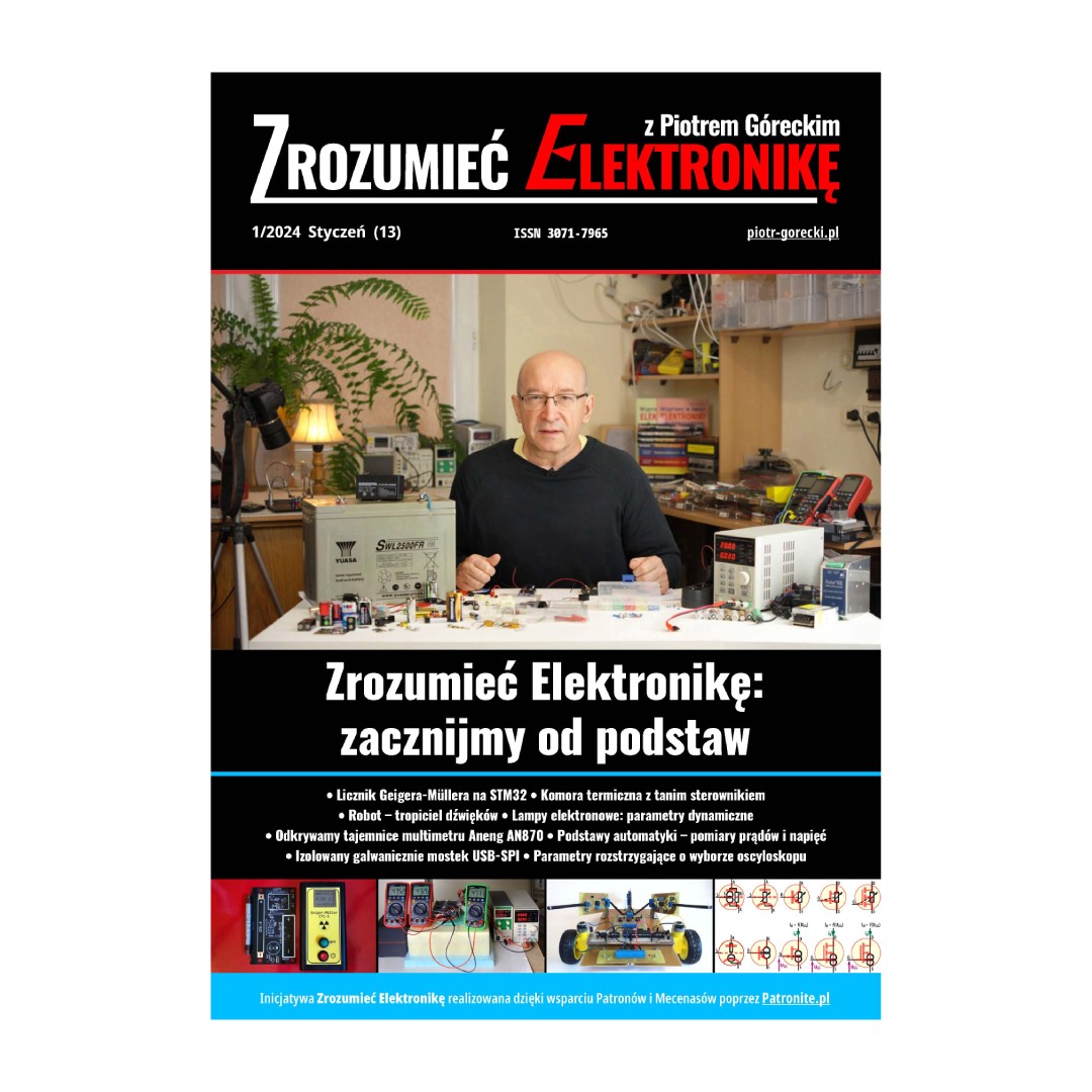 Zrozumieć Elektronikę to cyfrowy miesięcznik dla pasjonatów elektroniki, autorstwa Piotra Góreckiego. Artykuł okładkowy w numerze styczniowym to „Zrozumieć Elektronikę: zacznijmy od podstaw”. Jego wersją i uzupełnieniem jest film na YT, oznaczony B001. Artykuł jest wprowadzeniem do najróżniejszych zagadnień i aspektów elektroniki, także dla osób nietechnicznych i zupełnie początkujących. W numerze, wśród wielu wartościowych materiałów znajdziesz między innymi opis komory termicznej z tanim sterownikiem oraz licznika Geigera na STM32. Warto też polecić bardzo ważny artykuł na temat budowy, tajemnic i wad, naprawdę godnych uwagi, tanich multimetrów AN870 i ZT219. A także inny ważny artykuł o parametrach rozstrzygających o wyborze oscyloskopu. W wydaniu są artykuły o parametrach dynamicznych lamp elektronowych, jest opis hobbystycznej konstrukcji: „Robot - tropiciel dźwięków” i jest też materiał o rozmaitych powielaczach napięcia. Numer ISSN czasopisma: 3071-7965.