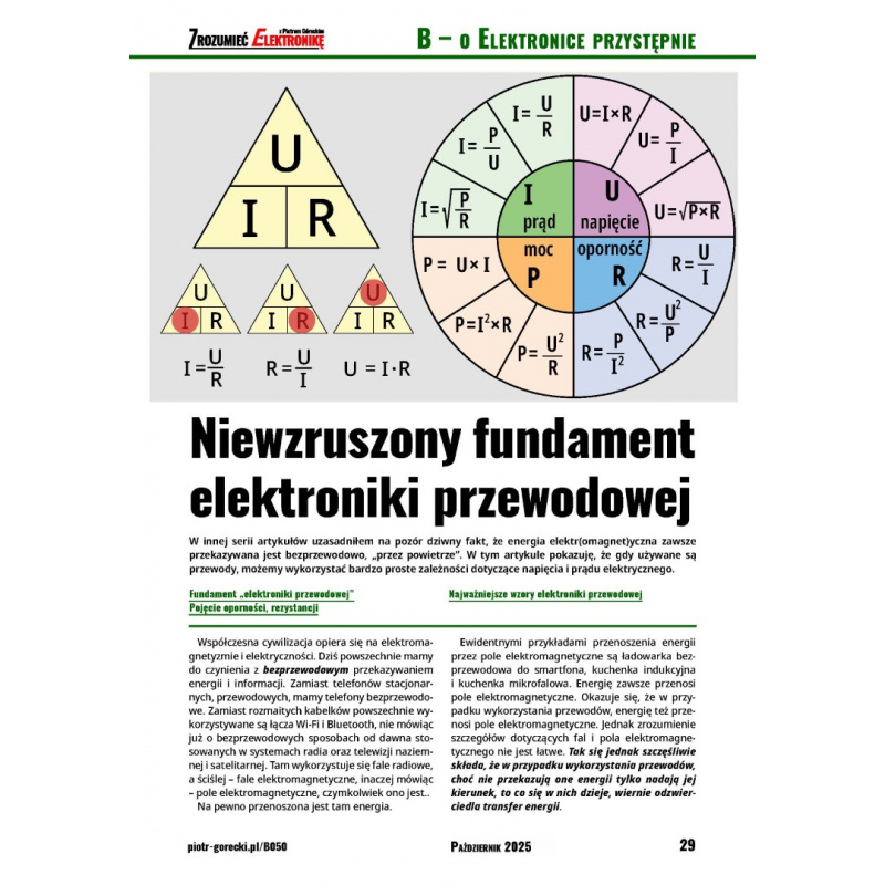 Drugi bardzo ważny artykuł ma tytuł Niewzruszony fundament elektroniki przewodowej. To w zasadzie jest obiecany początek cyklu dla zupełnie początkujących. Tak, ale polecam go też bardziej zaawansowanym, ponieważ poprzez przedstawione w nim wyobrażenie rezystancji, w następnych odcinkach bezboleśnie i w zaskakujący sposób dojdziemy do impedancji oraz do mocy czynnej, biernej i pozornej.