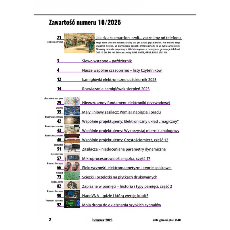W numerze jest artykuł Elektryczność, elektromagnetyzm i teorie spiskowe, będący uzupełnieniem filmu „Czy słyszał Pan o broni energii skierowanej?” - odpowiedź elektronika. Wcześniej omawiałem rożne odmiany tanich mierników impedancji. W tym wydaniu jest materiał o kolejnej interesującej propozycji. Na razie to odpowiedź na pytanie: NanoVNA - gdzie i którą wersję kupić? Będą kolejne artykuły o nanoVNA. W numerze są materiały dotyczące tak ważnych dla każdego elektronika zasilaczy. Polecam bardzo interesujące materiały: Zapisane w pamięci - historia i typy pamięci, artykuł Ścieżki i przelotki na płytkach drukowanych oraz Moja droga do okiełznania szybkich sygnałów.